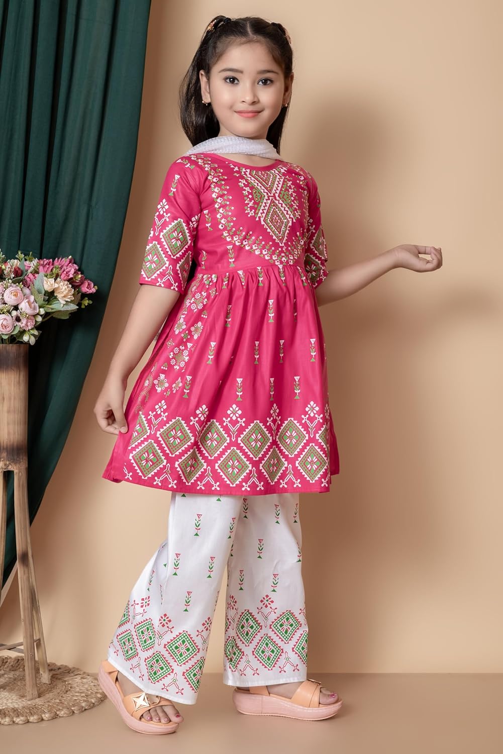 New Badshah Dressesn Ethnic Kids Girls Kurta Straight Pant with Silky Dupatta Dress Set, Cotton Rayon Fabric