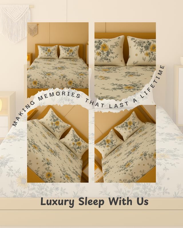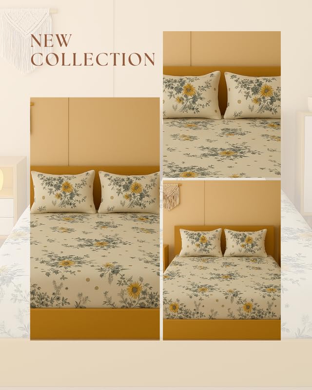 NEW LEAF Cotton Feel Double Bedsheets with 2 Pillow Covers | Double Bed Breathable | Wrinklefree | Ultrasoft 220 tc Supersoft Floral Multicolour | 90 x 90 Inches, Almond
