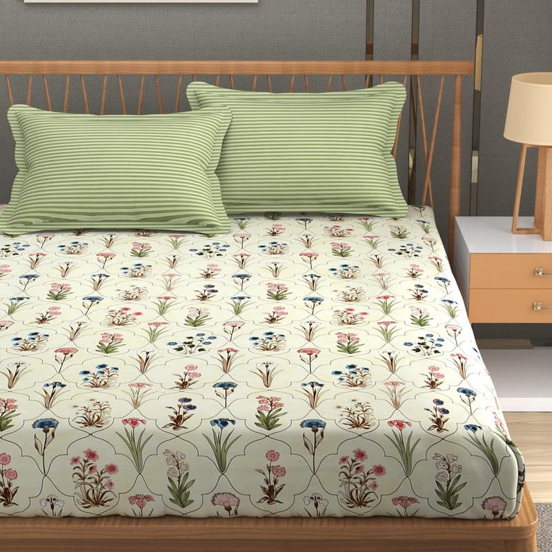 NEW LEAF Cotton Flat Double Bedsheets with 2 Contrast Pillow Covers | Double Bed Breathable | Wrinklefree | Ultrasoft |Summer Bedsheet 200 to 220 tc Floral | 90×90 Inches, Floral, Beige Blue