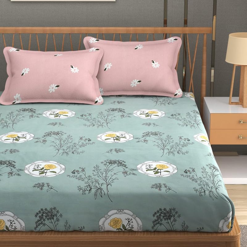 NEW LEAF Cotton Flat Double Bedsheets with 2 Contrast Pillow Covers | Double Bed Breathable | Wrinklefree | Ultrasoft |Summer Bedsheet 200 to 220 tc Floral | 90×90 Inches, Floral, Light Green