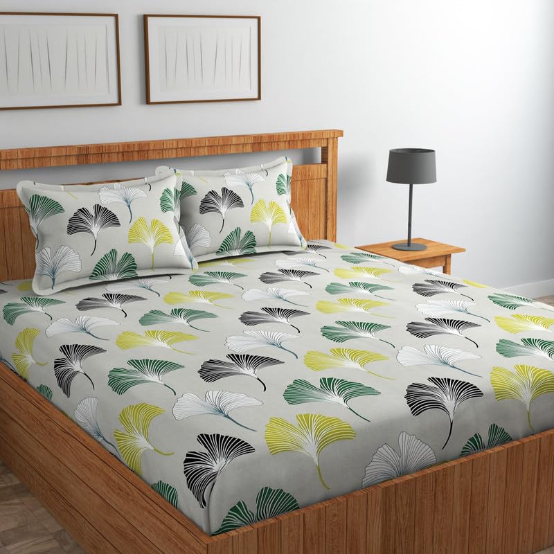 NEW LEAF Premium Cotton Flat Double Bedsheets with 2 King Size Pillow Covers | Double Bed Breathable | Wrinklefree | Ultrasoft 220 tc Supersoft Floral | 90×90 Inches, Abstract White & Green