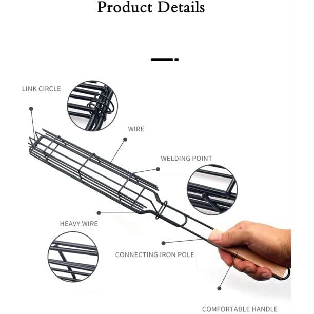 【Long handle design】:The grill basket with a long wooden handle can protect your hands from the effects of high temperature grilling, prevent scalding and ensure safe operation.