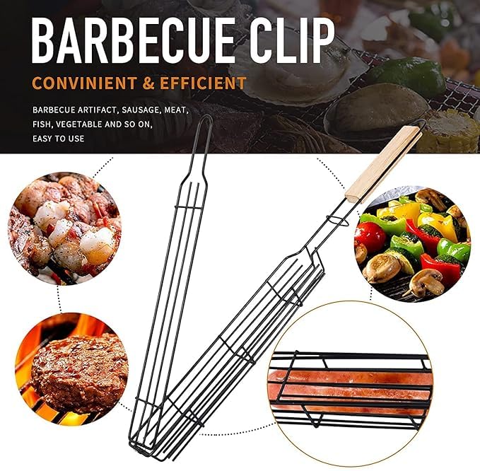 Versatile Uses Our kabob grilling baskets with heat-resistant wooden handles and kebab skewers are perfect for grilling burgers, steaks, seafood, vegetables, fish, meat, shrimp, diced meat, meatball, chicken, sausages, fruits and other delicate foods