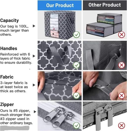 Non-woven Printed Storage Bags [3 Pack/100L] Large Blanket Clothes Organization and Storage Containers for Comforters, Bedding, Foldable Organizer, Grey, Non-Woven Fabric