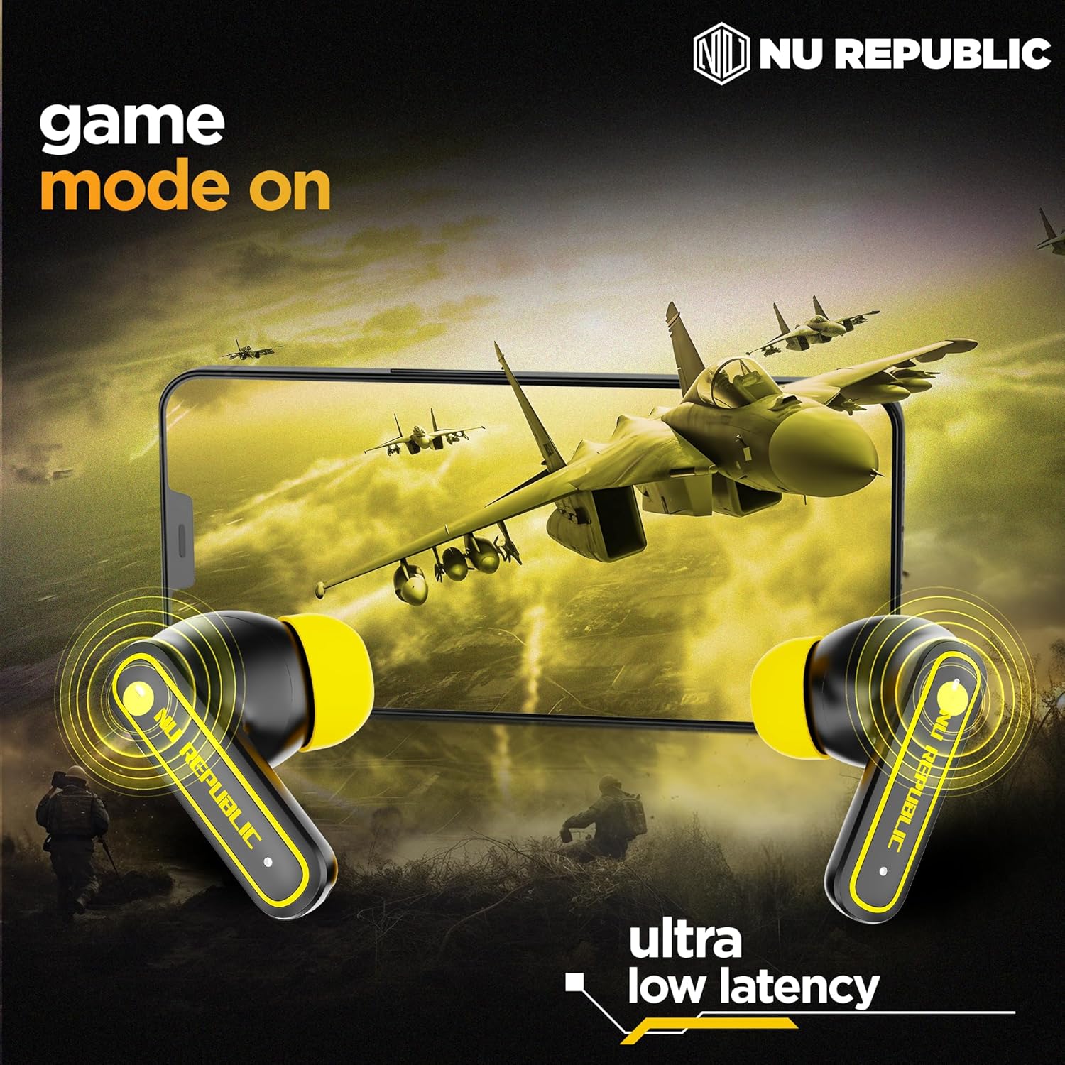 Nu Republic Epic ANC TWS Earbuds with Upto 64 hrs Playtime, 13mm Neodymium Driver, XBass® Technology, ANC + ENC Quad Mics, Hall Sensor Function, Dual Mode (Game/Music), Fast Charging – (Black/Yellow)