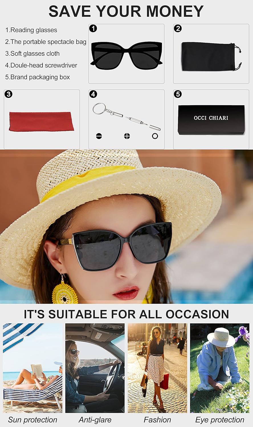 This kind of glasses has a very special detail—–shiny design in the frame.It makes you look more trendy and charming.Also,the nose pad is skin-friendly,and it will not pressure on your nose.