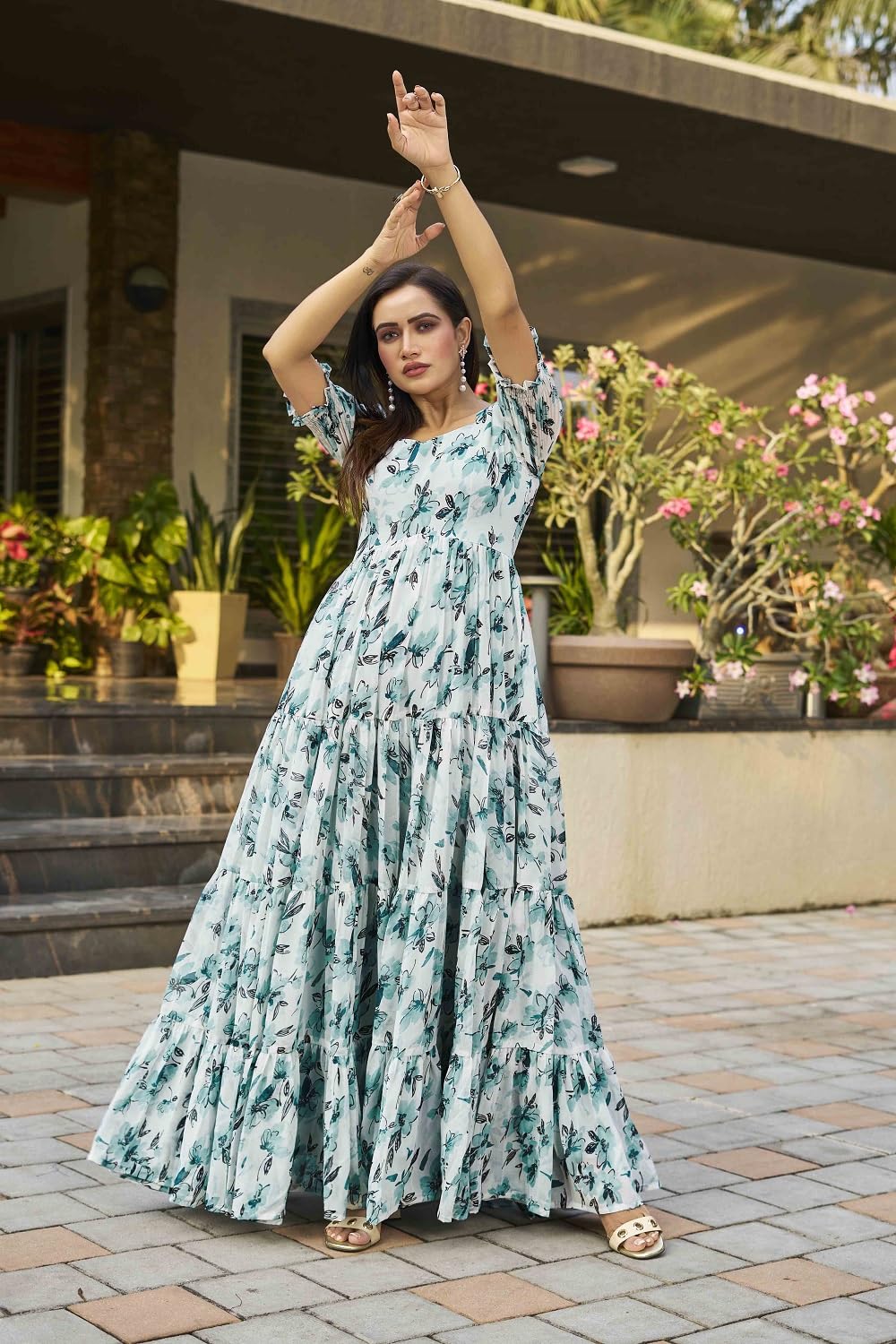 Indulge in regal allure with our women’s embroidered flared gown, a resplendent creation crafted from luxurious silk in a majestic royal blue hue. This gown, featuring a round neck, all over print, short sleeves, and a sweeping maxi length, is a harmonious symphony of timeless elegance and contemporary sophistication. The royal blue silk fabric drapes luxuriously, exuding opulence and refinement. The round neck design introduces a classic and universally flattering silhouette, providing an exquisite frame for your neckline and allowing for versatile accessorizing to suit the occasion. Short sleeves bring a modern and chic touch to the gown, striking a perfect balance between coverage and comfort. Ideal for those seeking a contemporary aesthetic, the short sleeves add versatility, making the gown suitable for a range of events and seasons. This thoughtful design allows for ease of movement while maintaining an air of sophistication. The maxi length of the gown creates a breathtaking and elegant silhouette, ensuring you make an unforgettable entrance at any formal affair. The flowing silk fabric gracefully cascades, contributing to the overall allure and making this gown a standout choice for evening events and grand celebrations.