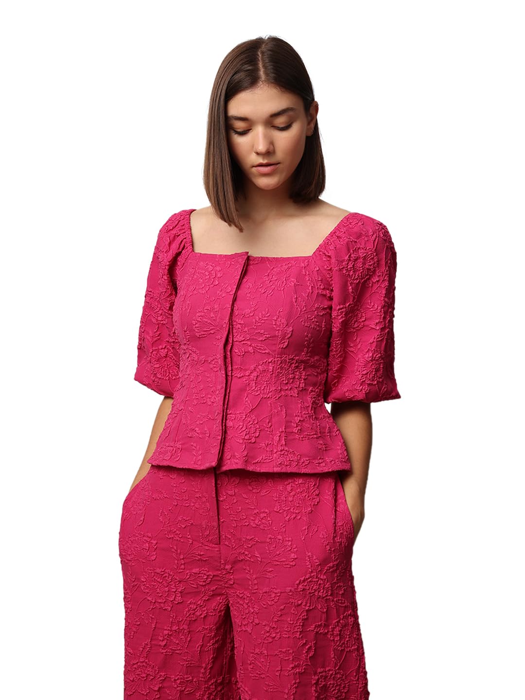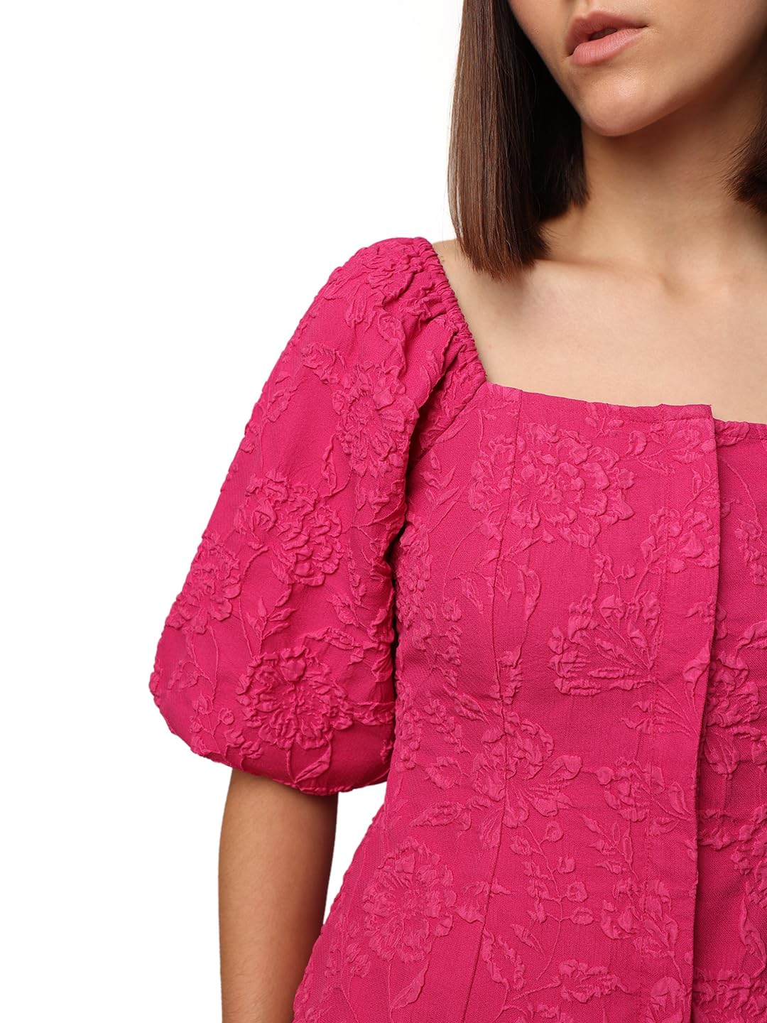 ONLY Women Polyester Regular Fit Jacquard Weave Square Neckline Puff Sleeves Top