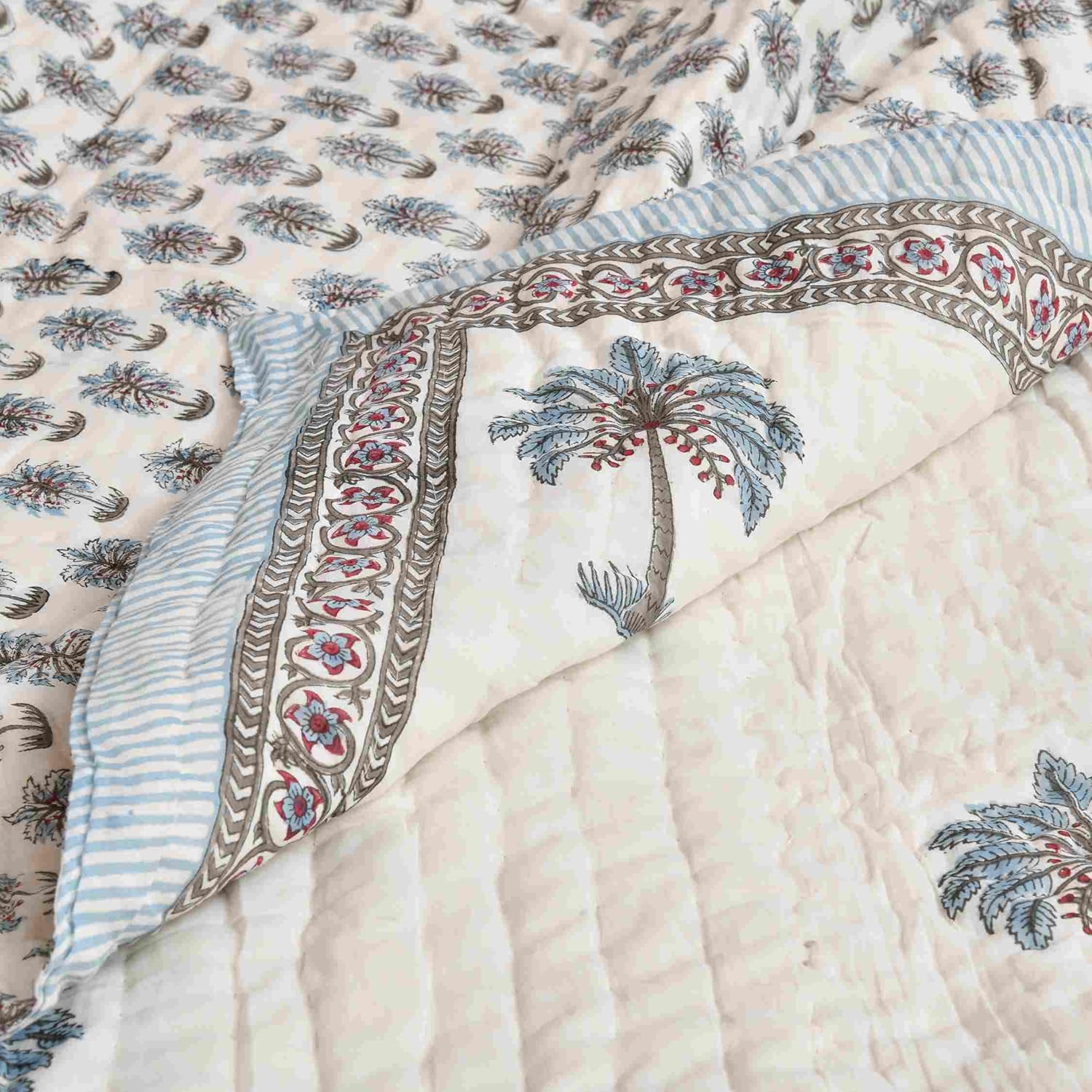 Original Pure Cotton Jaipuri Razai Block Blue Cypress Tree Print Reversible Comforter Lightweight AC Quilt Summer and Winter Bedding | Throw Bed Blanket (King Size 108X108 in)