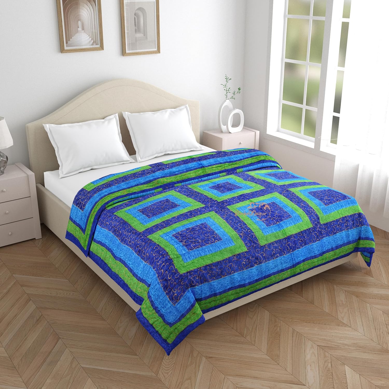 Original Pure Cotton Jaipuri Razai Blue and Orange Green Print Reversible Comforter Lightweight AC Quilt Summer and Winter Bedding | Throw Bed Blanket Double Bed