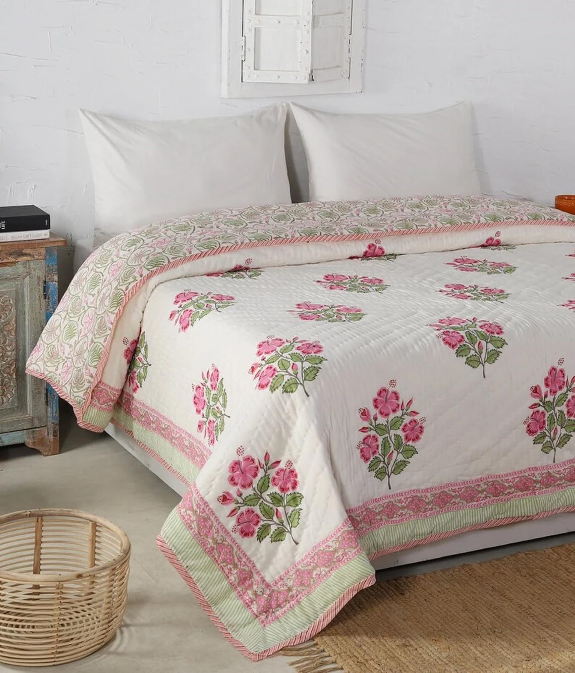 Original Pure Cotton Jaipuri Razai Hand Block Single Bed Reversible Comforter Lightweight AC Quilt Summer and Winter Bedding | Throw Bed Blanket (Pink and Green Flower)