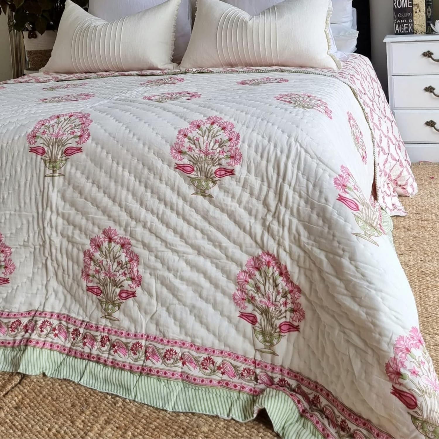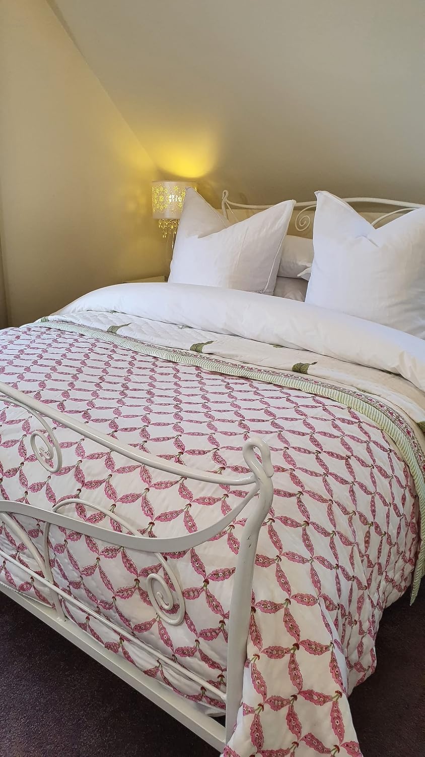Original Pure Cotton Jaipuri Razai Hand Block Single Bed Reversible Comforter Lightweight AC Quilt Summer and Winter Bedding | Throw Bed Blanket (Pink Butta)