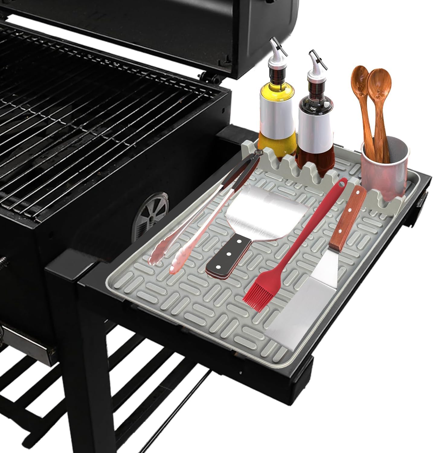 Practical Size and Design: Our large size 16×11.5″ silicone spatula mat, is perfect for your grilling needs. Use it as a grill BBQ caddy seasoning jars holder or to keep multiple utensils like ladles and spoons organized on your barbecue grill side shelf. Keep your kitchen, cooking area, and countertop clean and tidy effortlessly.