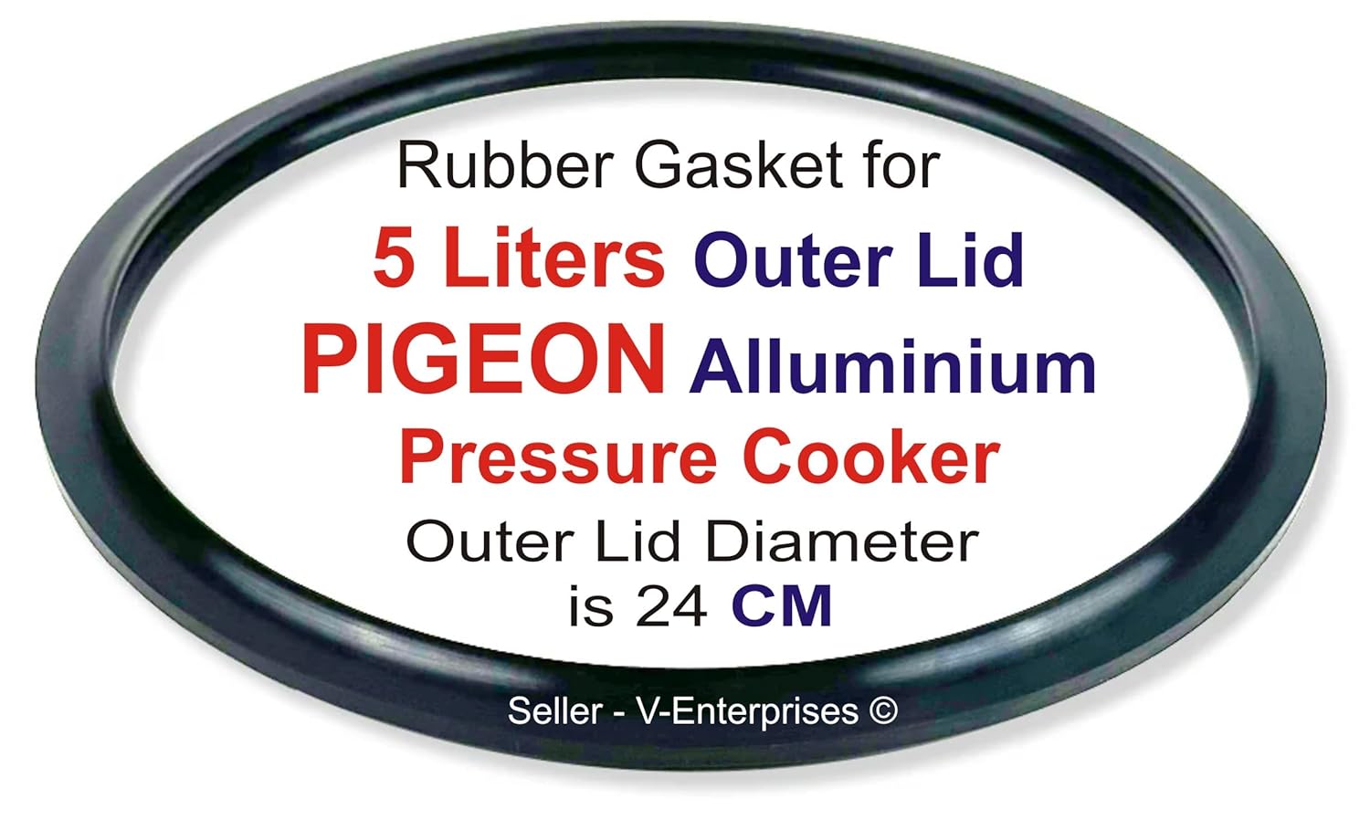 Rubber Gasket compatible for Outer Lid 5 Litre Pigeon Alluminium Pressure Cooker. Rubber Gasket are rigorously tested for the following : Hardness, tensile Strength, Elongation at Break, Hot Air Properties, Steam Ageing Properties, Compression Set, Zink Oxide %, Heavy metal & For Dimention and dinish