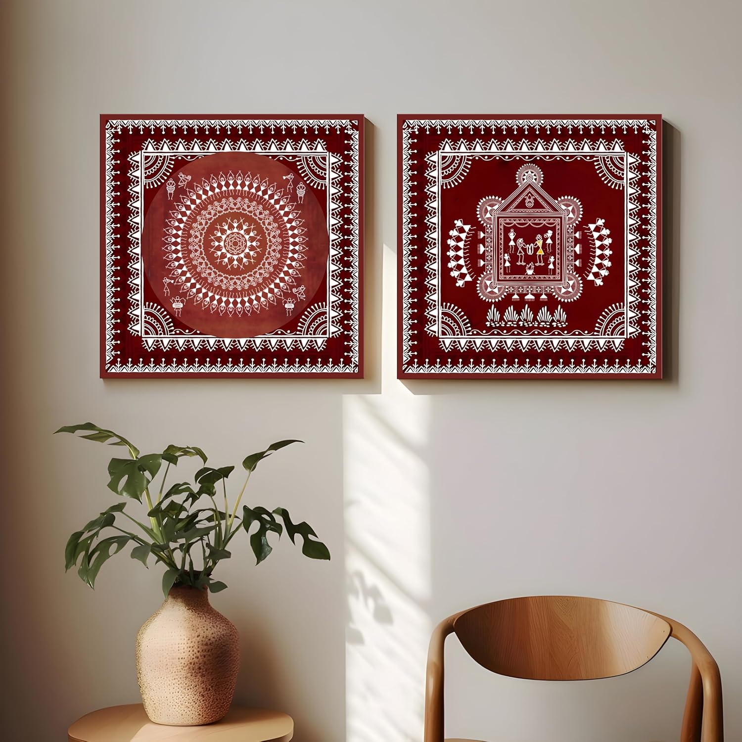 WHAT IN THE BOX: Set of 2 Warli Tribe wall painting || Size- 12×12 Inches || Pre Installed back hanging hook.