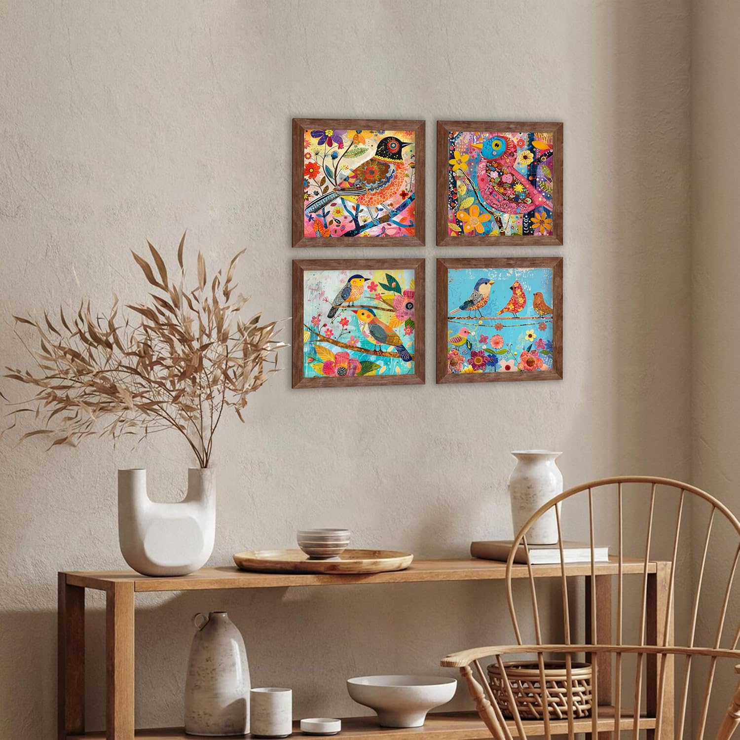 PAINTINGMANTRA Colorful Birds & Flowers Wall Art Prints, Vibrant Botanical Designs with Exotic Birds Paintings for Home, Living room & Office Decor (9×9 Inches, Set of 4)