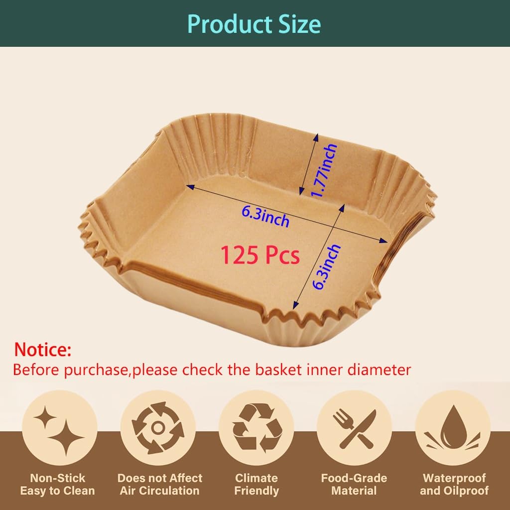PERFECT FIT: 6.3*6.3inch square bottom diameter liners perfectly sized to fit standard square air fryer baskets,while allowing proper air circulation,Pack includes 125 pieces disposable liners , providing excellent value for frequent air fryer users