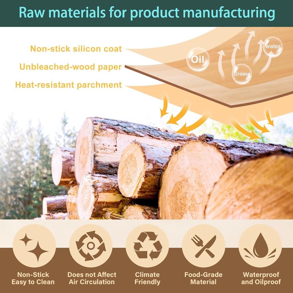 Healthy and Reliable Material: – Our Air fryer parchment liners are made from 100% virgin wood pulp with a silicone coating. They are unbleached, no fluorescent agent, oil-proof, waterproof, non-stick, and can withstand temperatures up to 428°F