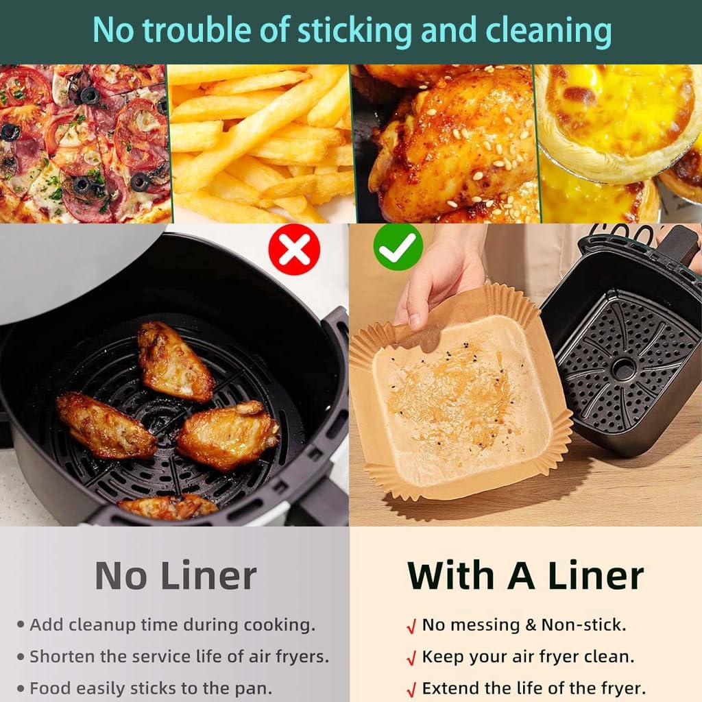 Simple to Use: The air fryer disposable paper liners are like a square bowl,suitable for both 3-5 Qt square Baskets, etc., but can also be used in ovens, microwaves. When used in an air fryer, there is no need for measurement or cutting. Just place the parchment paper liner in the air fryer basket or on the tray, and put enough food on the liner. It will not affect the taste of the food at all