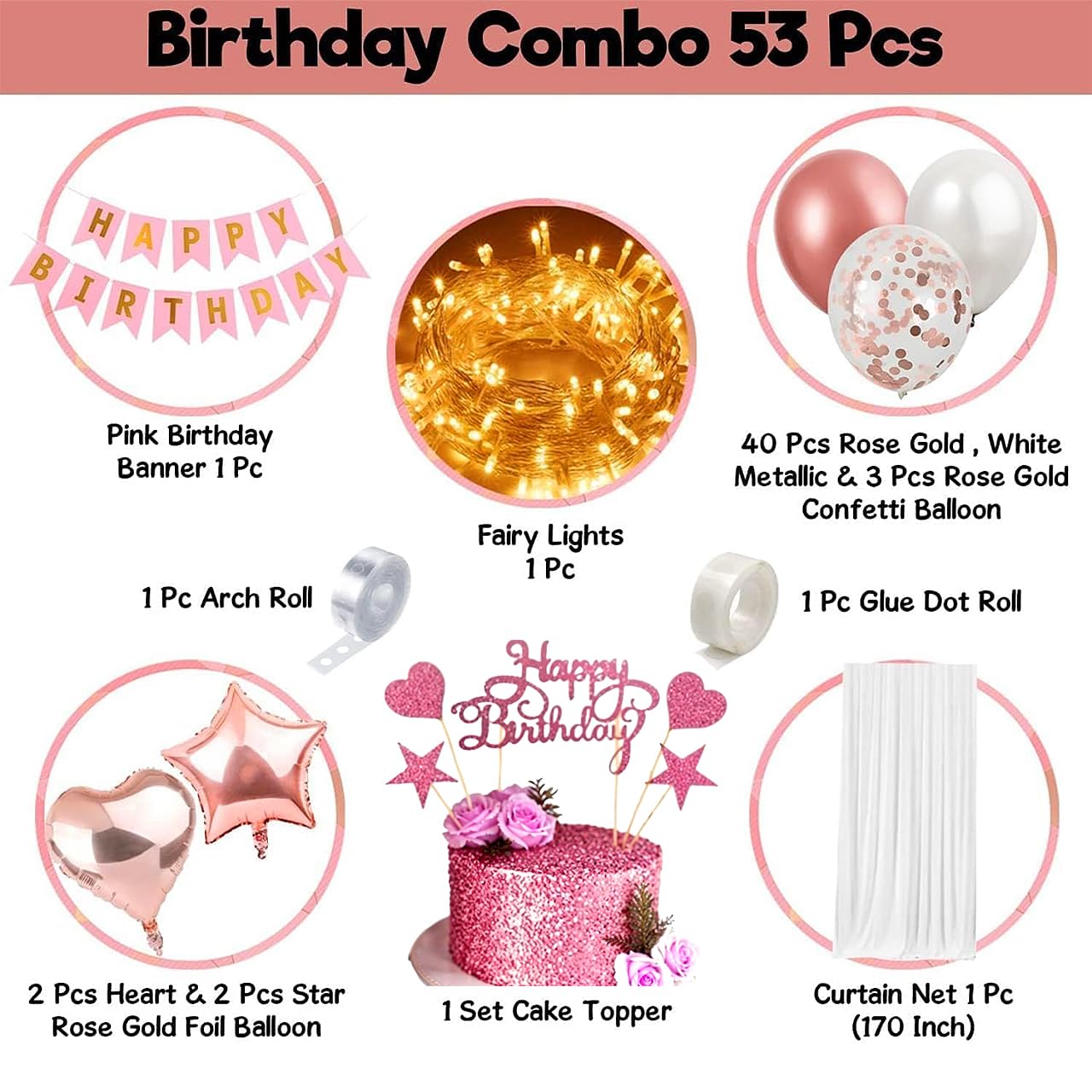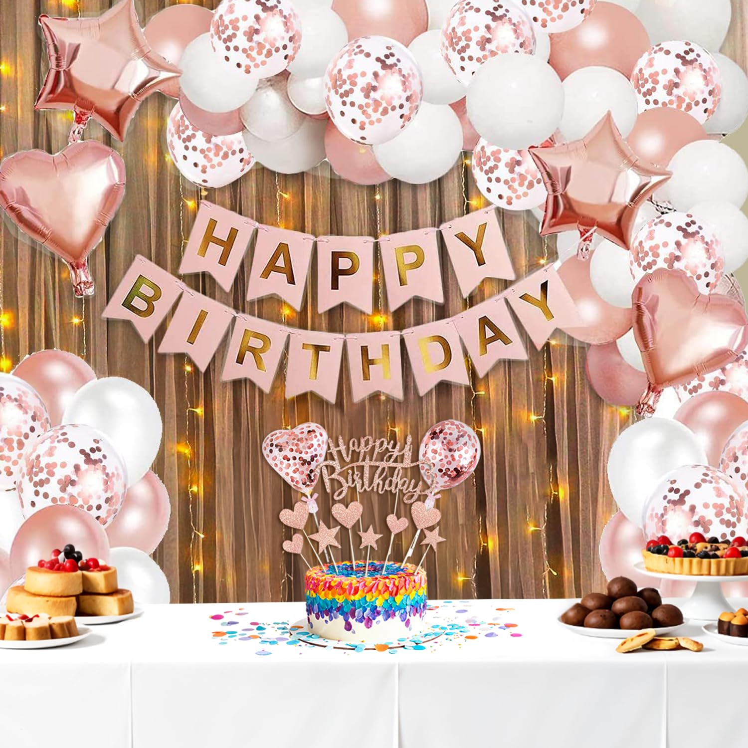 WHAT ITEMS YOU WILL GET IN THE PACKET- This birthday decorations for girls pack will include 1Pc Curtain net, 1Pc lights, 1set cake topper, 1 Pc pink happy birthday banner (cardstock), 2pcs rose gold heart foil balloons, 2Pcs rose gold star foil balloons, 40Pcs rose gold and white metallic balloons, 3 Pcs rose gold confetti balloons, 1Pc balloon arch, 1Pc balloon glue dot for birthday decorations items for girl, wife.