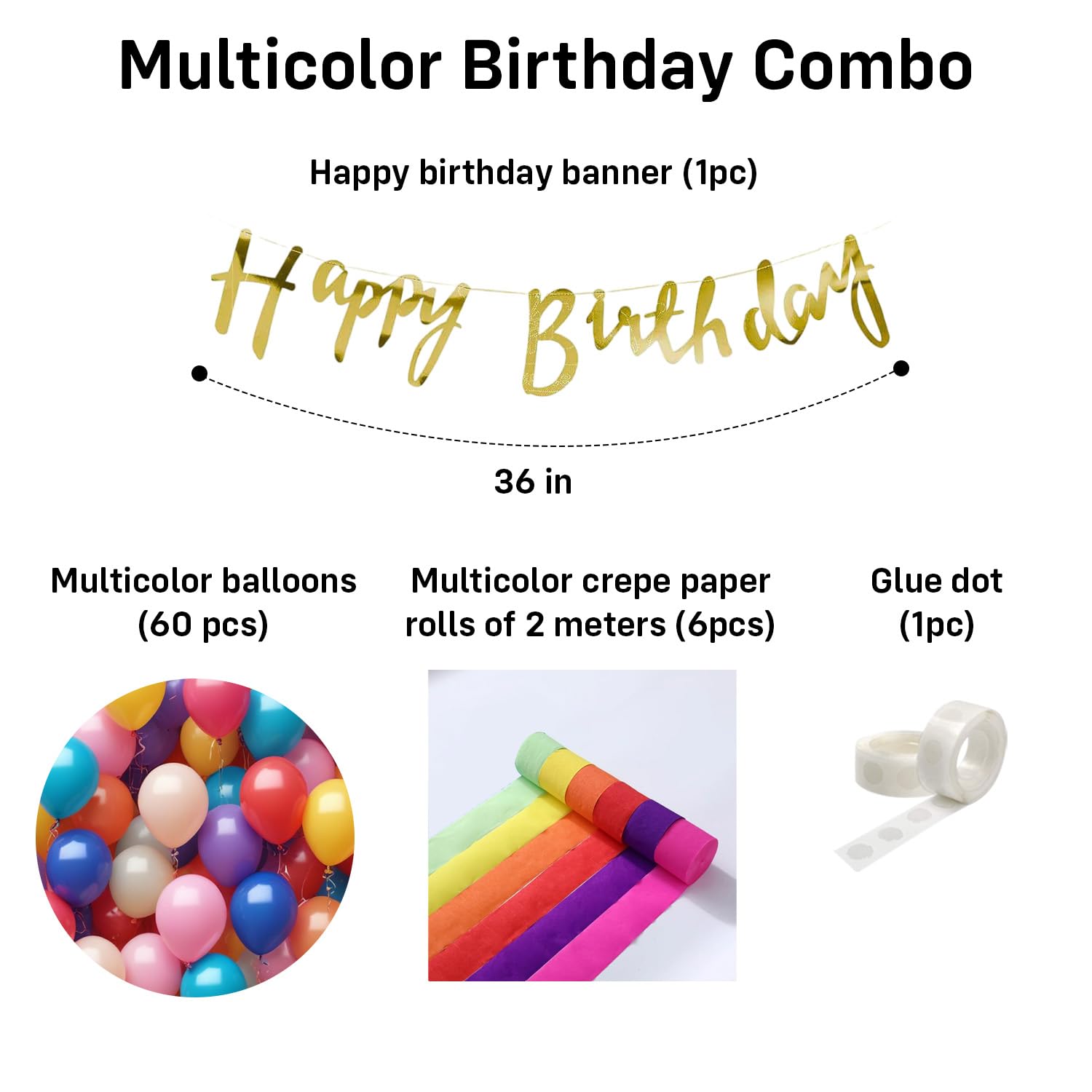 COMPREHENSIVE RAINBOW THEME BIRTHDAY DECORATIONS: This Party Propz Multicolor Happy Birthday Decorations kit includes 1 “Happy Birthday” banner (cardstock), 60 colorful balloons, multicolor crepe paper rolls of 2 meters each, and 1 glue dot. Perfect for creating vibrant and festive birthday decorations for kids and adults.Multicolor Happy Birthday Decorations ideal birthday decoration kit for birthday decoration kit for girls