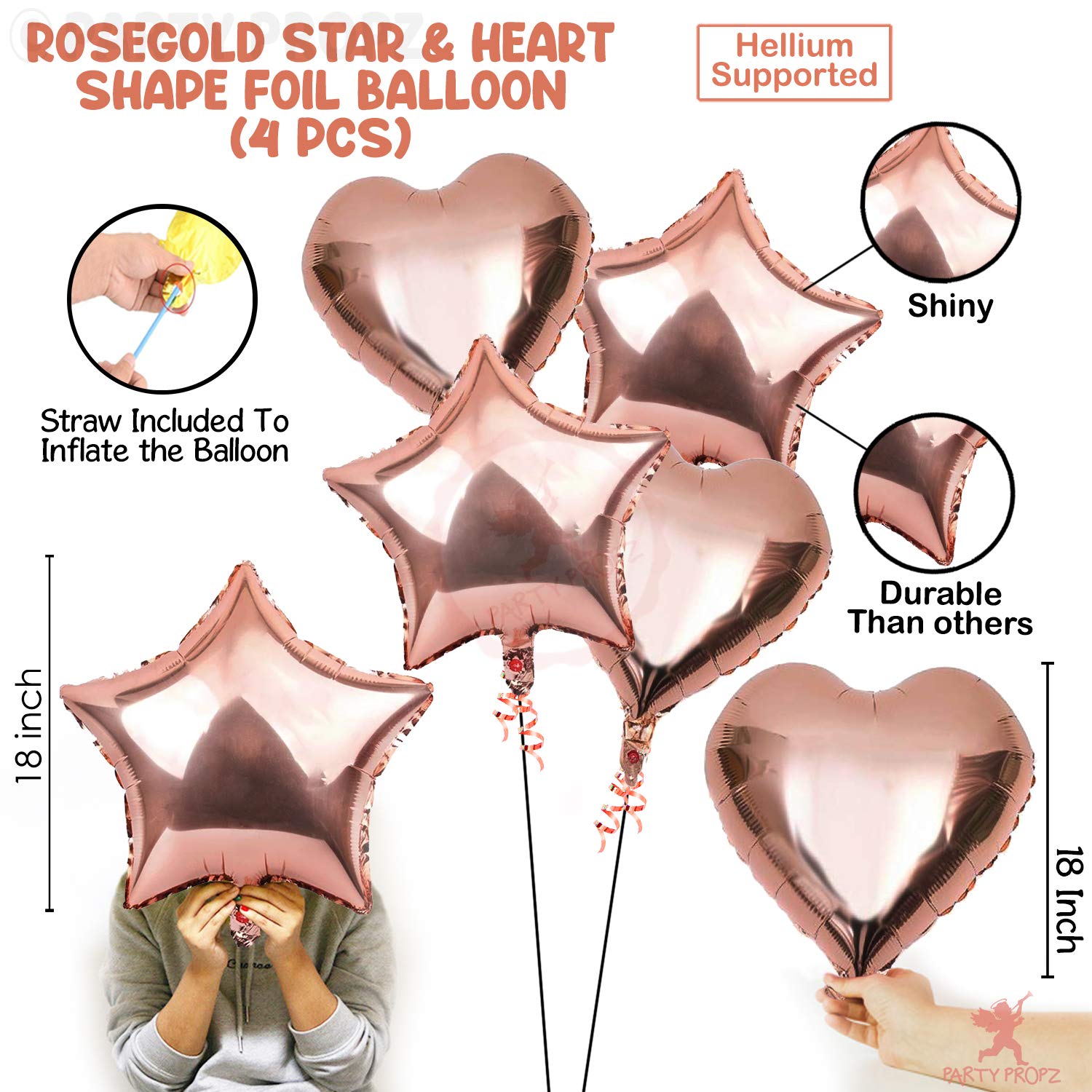 PREMIUM QUALITY FOIL BALLOONS FOR BIRTHDAY DECORATION: The rose gold heart shape balloon and rose gold star balloon are made to shine bright and last longer. These foil balloons for birthday decoration help create an enchanting atmosphere, adding sparkle to your setup. Combine them with the latex and confetti balloons for a balanced and luxurious look. These foil balloons are easy to inflate and perfect for pairing with ribbons, balloon stands, or arches.