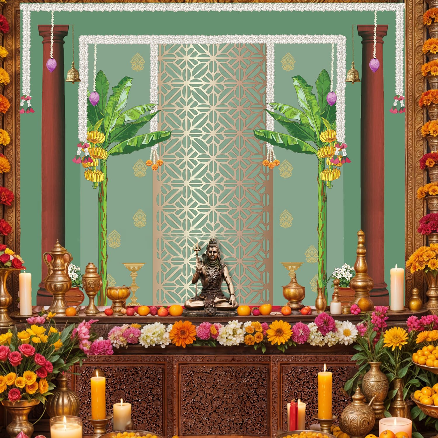 Add a touch of authentic traditional charm to your celebrations with this beautifully printed banana leaf backdrop. Featuring vibrant temple pillars, banana leaves, hanging bells, and traditional décor elements, this set creates a perfect spiritual and cultural ambiance. Ideal for pooja, wedding ceremonies, Diwali, housewarming functions, or Navratri décor, this backdrop transforms any wall or corner into a grand festive display.