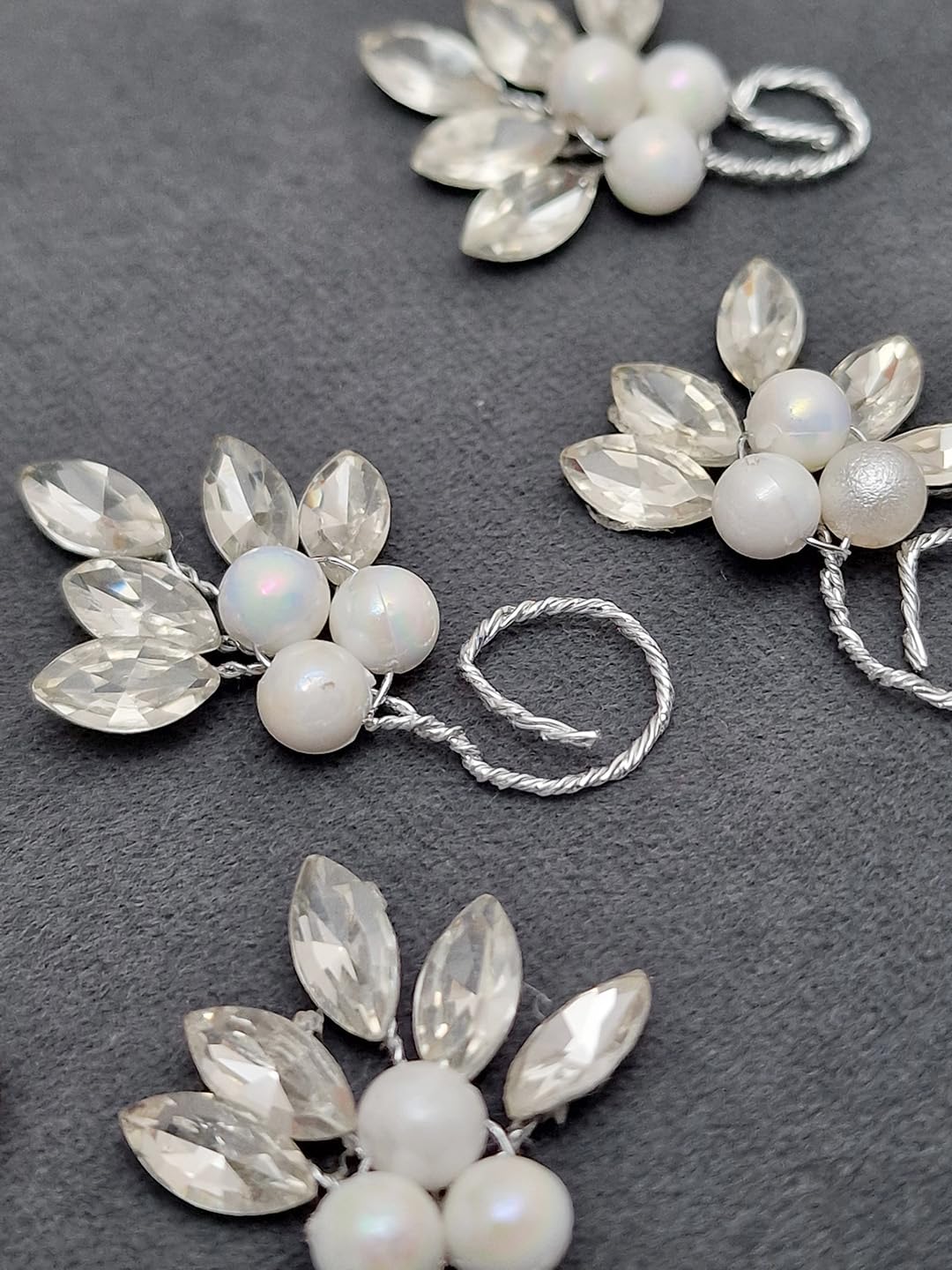 Transform your special occasion hairstyle with these exquisite pearl and crystal flower hair pins. Each delicate pin features a beautifully crafted flower design combining lustrous white pearls at the centre surrounded by crystal-clear petals that catch and reflect light magnificently. The set includes multiple pins crafted with silver twisted wire stems, offering versatile styling options for your hair. Perfect for weddings, formal events, or adding a touch of elegance to any ensemble, these hair accessories blend timeless charm with practical functionality. The lightweight design ensures comfortable wear throughout your event, while the secure twisted wire construction keeps each pin firmly in place. These versatile hair pins complement both elaborate updos and simple hairstyles, making them an essential accessory for brides, bridesmaids, or anyone seeking to add a refined, feminine touch to their look. The classic white and silver colour scheme coordinates seamlessly with any outfit or wedding theme.