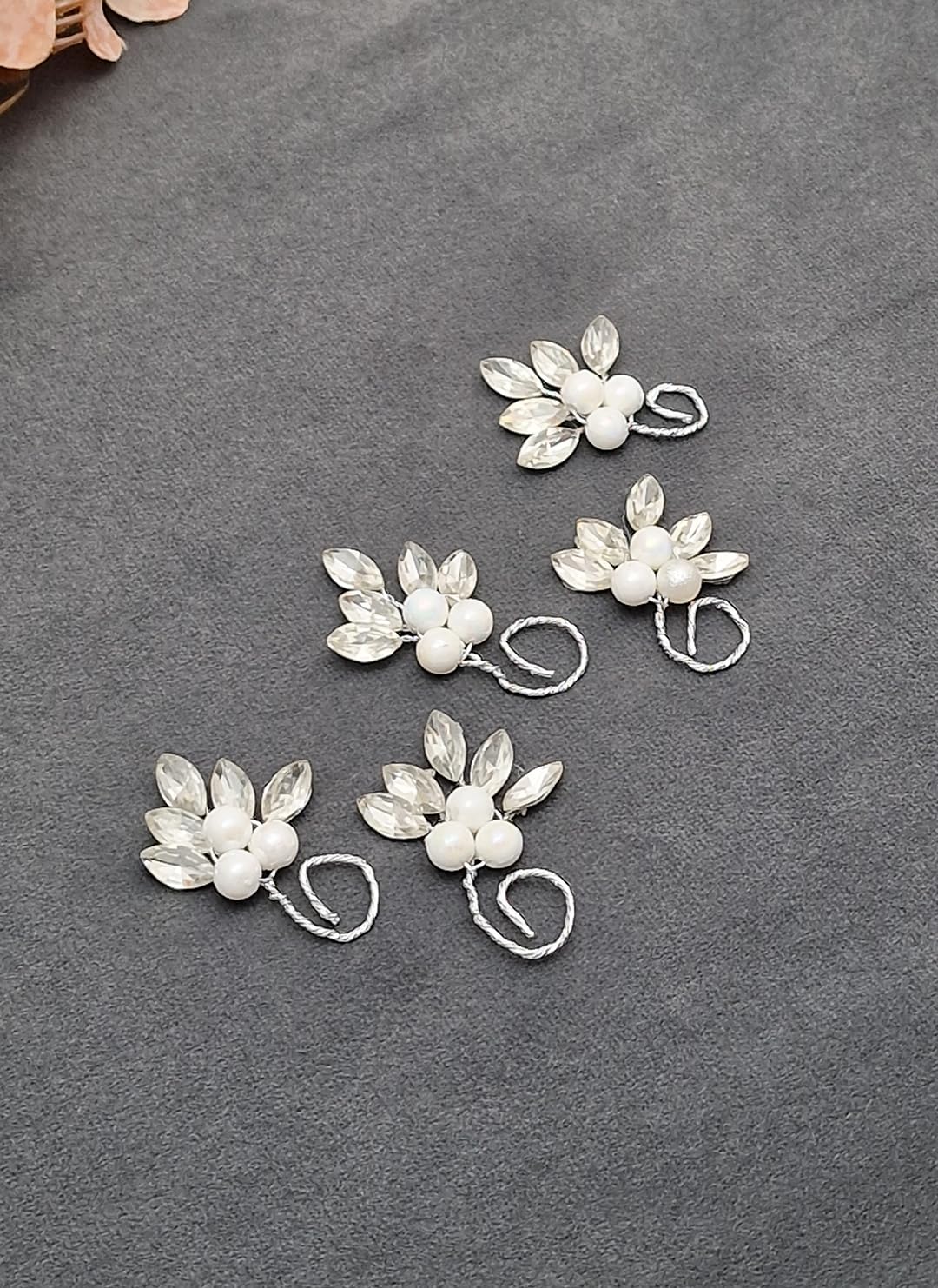 SET CONTENTS: Package includes 5 matching hair pins, each adorned with 6 clear faceted petals and 3 white pearl-style beads