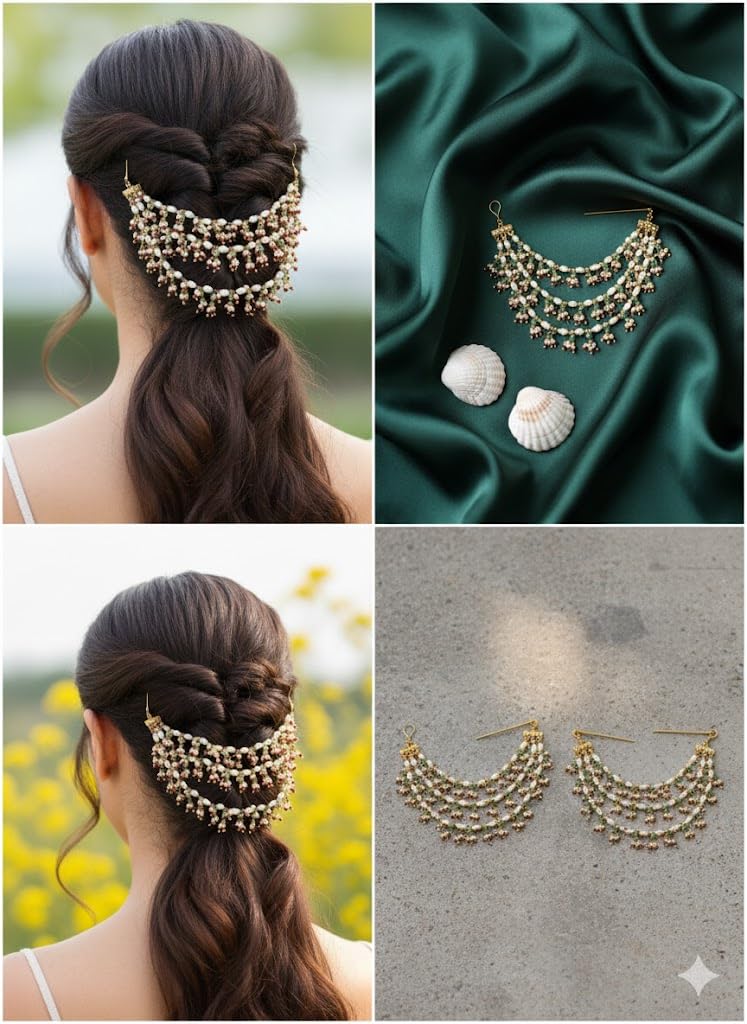 Enhance your hairstyle with this elegant Pearl Beaded Hair Accessory, beautifully designed with a gold finish and multicolor stones for a graceful and luxurious look. This stylish hair jewellery adds charm and sophistication to any hairstyle, making it a perfect accessory for both traditional and modern outfits. Ideal for weddings, bridal functions, parties, festivals, office wear, and everyday use, this hair clip is lightweight, comfortable, and easy to wear. The secure grip ensures it stays in place throughout the day, giving you confidence and comfort during long hours. This bridal hair jewelry is a wonderful choice for special occasions and also makes a thoughtful gift for women and girls on birthdays, anniversaries, weddings, and festive celebrations. Whether styled with sarees, lehengas, gowns, or suits, this pearl beaded hair accessory adds a touch of elegance to your overall look.