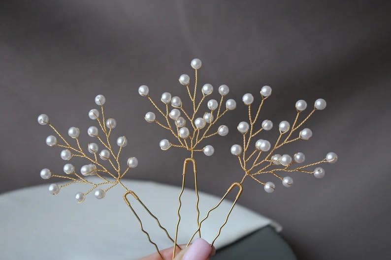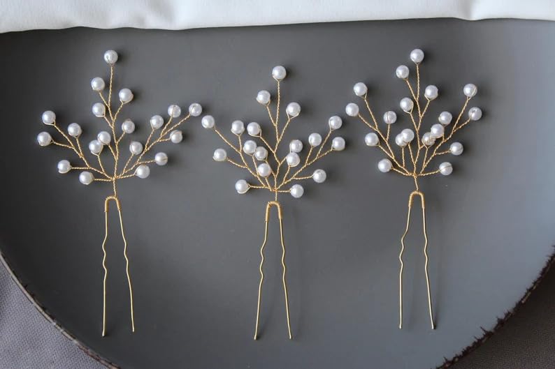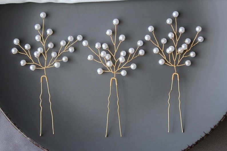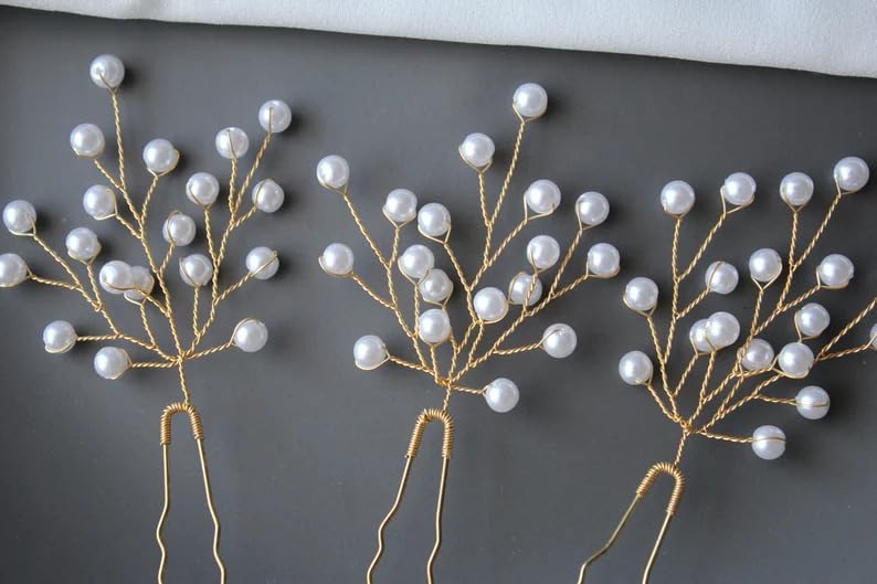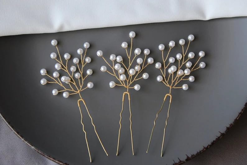 Pearl Bridal Hair Pins, Set of Gold Hair Pins, Pearl Hair Clips, Gold Wedding Hair Clips, Bridesmaids Hair Piece, Wedding Hair Accessory | Bun Pin | Hair Comb Pins | 3 Pcs White + Gold.