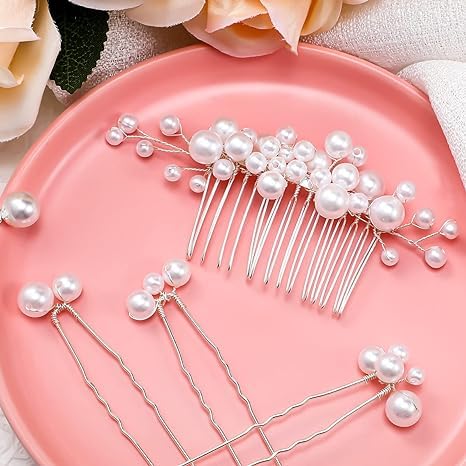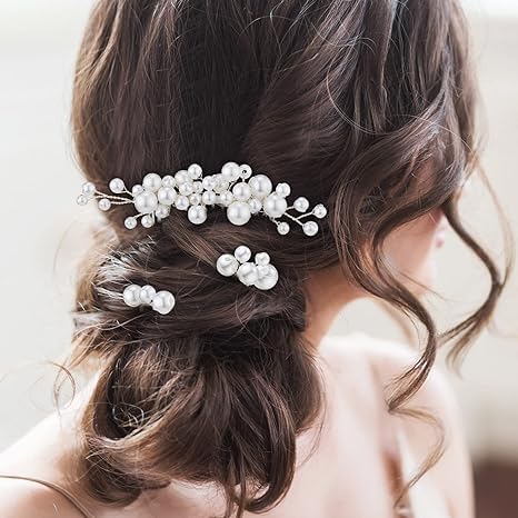 ✨Faux Pearls Design: hair pins for wedding hairstyles are decorated with faux pearls, elegant design will make your hair shine under sunlight and spotlight, you can combine these styles together or use them separately, add charms to your whole style.