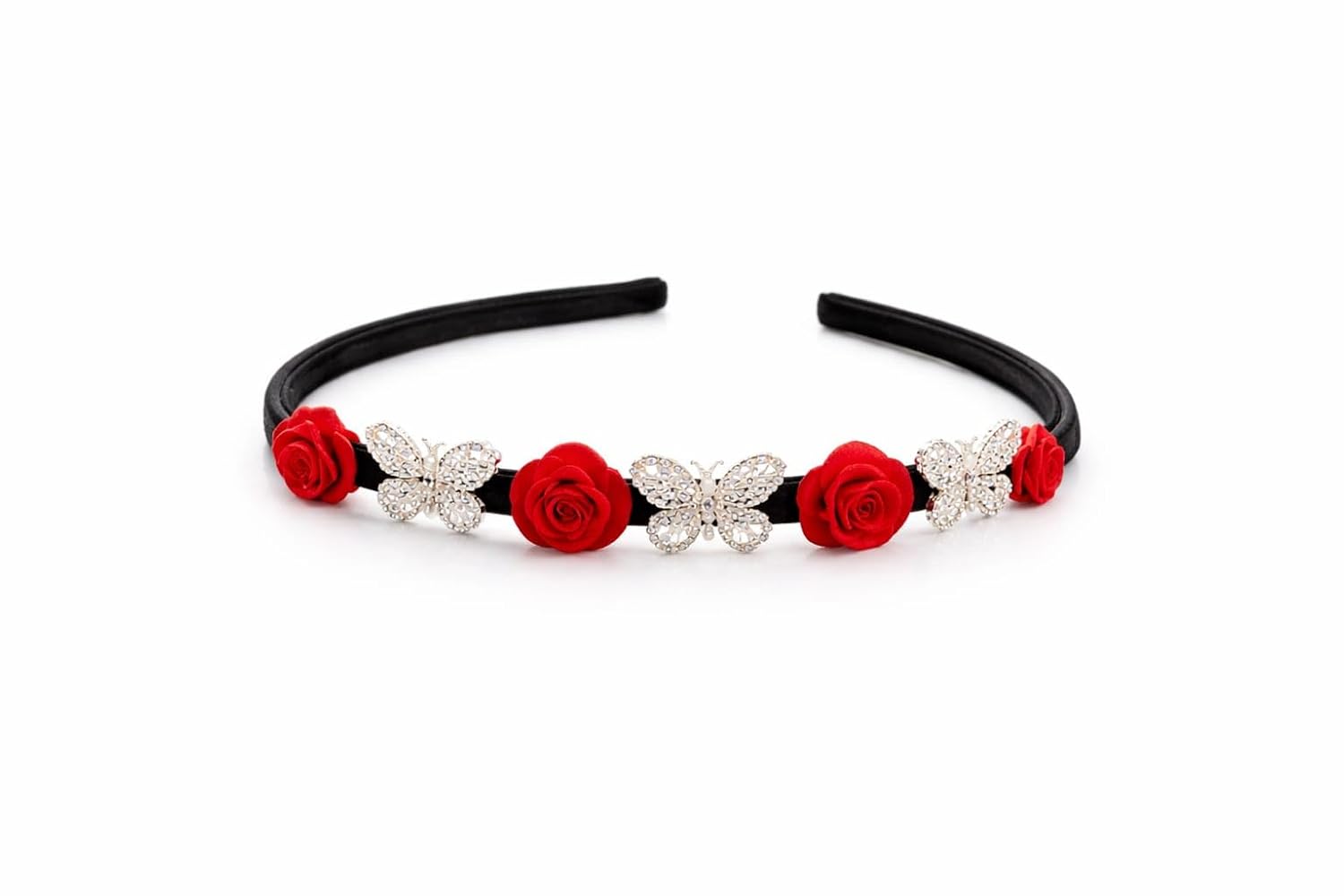 Add a touch of elegance and charm to your hairstyle with this beautifully designed Floral Butterfly Hair Band, crafted to enhance both everyday and special occasion looks. Featuring a sleek black base, the hairband is adorned with delicate red fabric roses and sparkling crystal butterfly accents that create a graceful and eye-catching design. Made with attention to detail, the soft roses give a romantic floral appeal, while the crystal butterflies add just the right amount of shimmer without looking heavy. The lightweight and flexible band ensures a comfortable fit, making it suitable for long hours of wear without causing discomfort or hair pulling. This versatile hairband pairs effortlessly with office wear, casual outfits, party looks, and traditional attire, making it a perfect accessory for multiple occasions such as weddings, festivals, birthdays, and celebrations. Whether worn with open hair or styled hairstyles, it enhances your overall appearance with ease. Designed for durability and style, this hairband is an excellent choice for women and girls who love elegant accessories. It also makes a thoughtful gifting option for loved ones on special occasions. Simple, stylish, and timeless—this hairband is a must-have addition to your accessory collection.