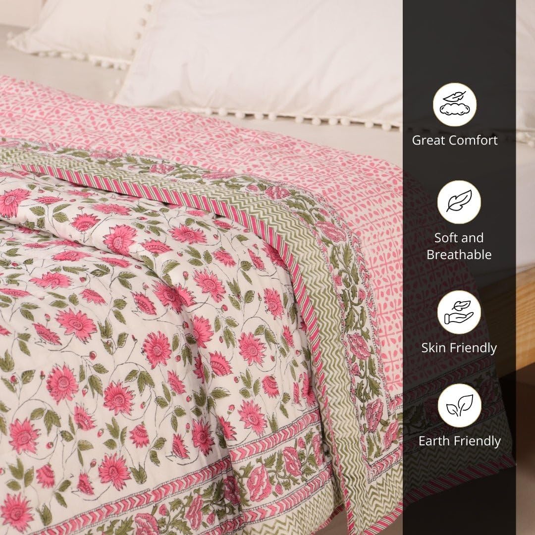 Beautiful Floral Design: Featuring unique hand block printed floral motifs on both sides, this quilt adds a touch of delicate allure to your bedroom decor.