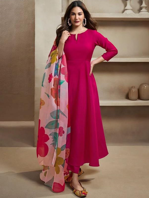 Perabin Women’s Rani Pink Roman Gown Kurta Set with Pant & Floral Digital Print Chanderi Dupatta (M213)