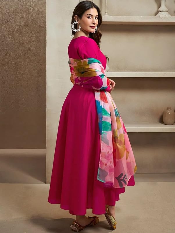 • Perabin Women’s Rani Pink Roman Gown Kurta Set with Pant & Floral Digital Print Chanderi Dupatta (M213)