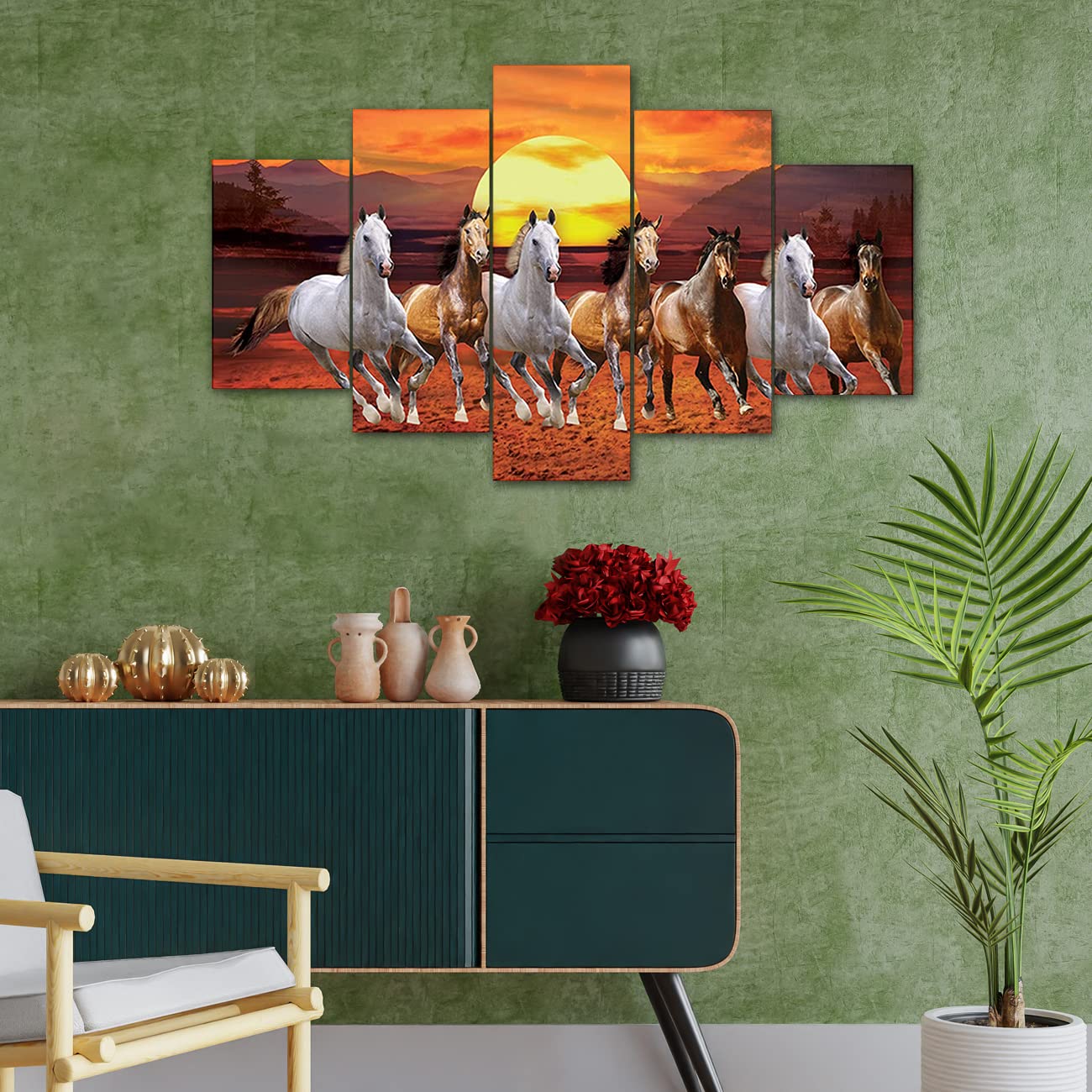 perpetual 3D Wall Painting Set of 5 | Painting For Wall Decoration |Seven Horses Vastu Painting with Frame for Living Room (75 x 43 cm) – Multicolor, Wood