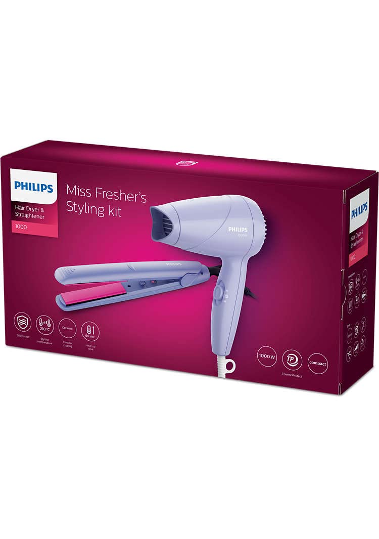 Philips HP8643/56 1000 Watts Hair Dryer and Straightener Combo, Miss Fresher’s Styling Kit, Purple