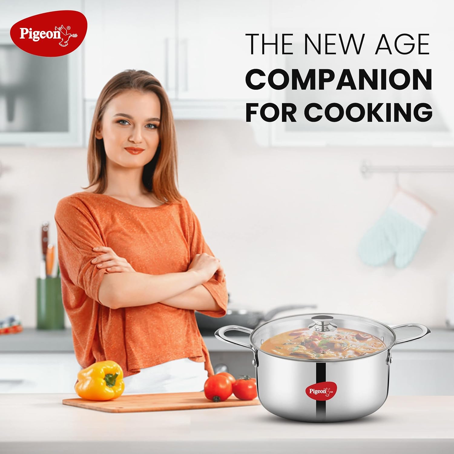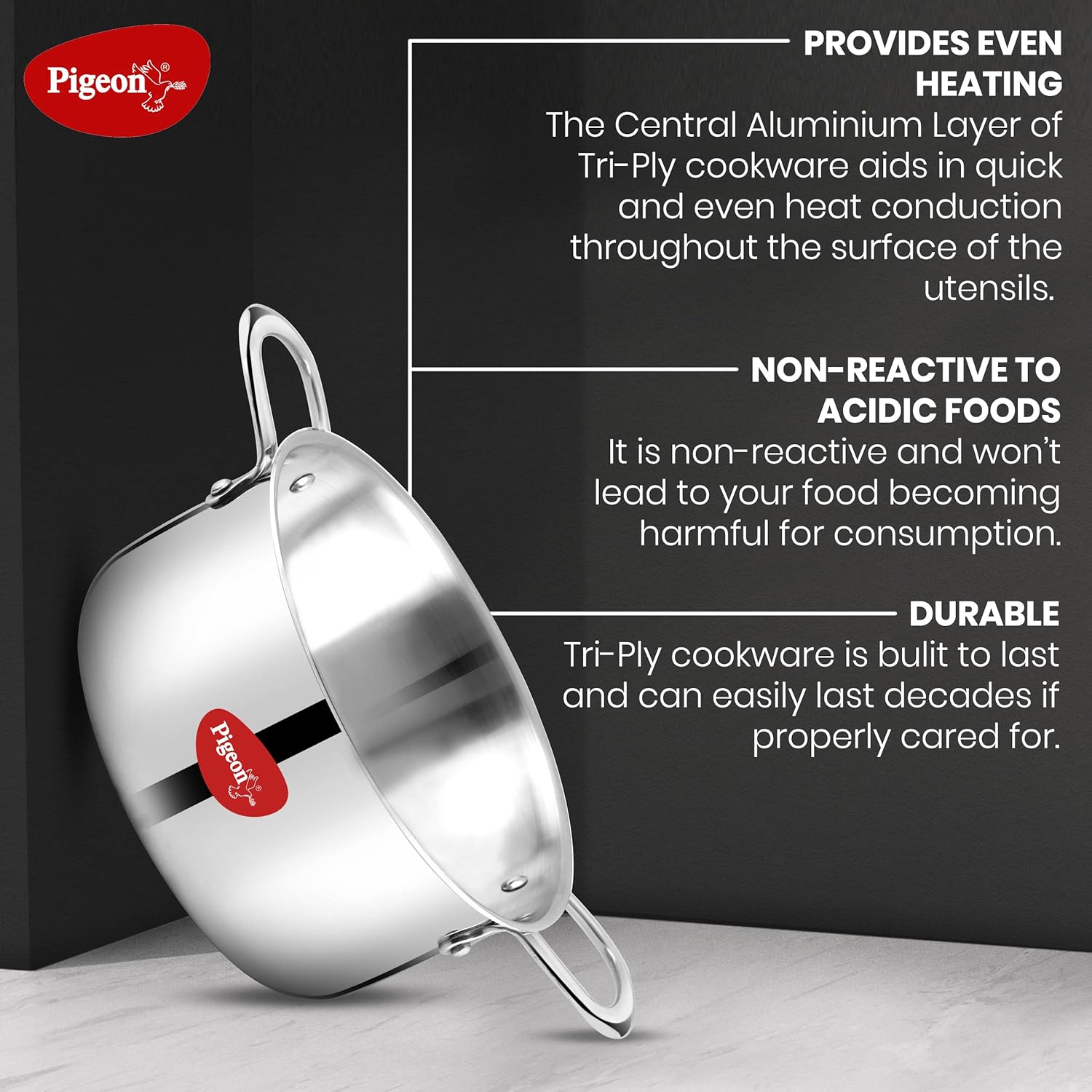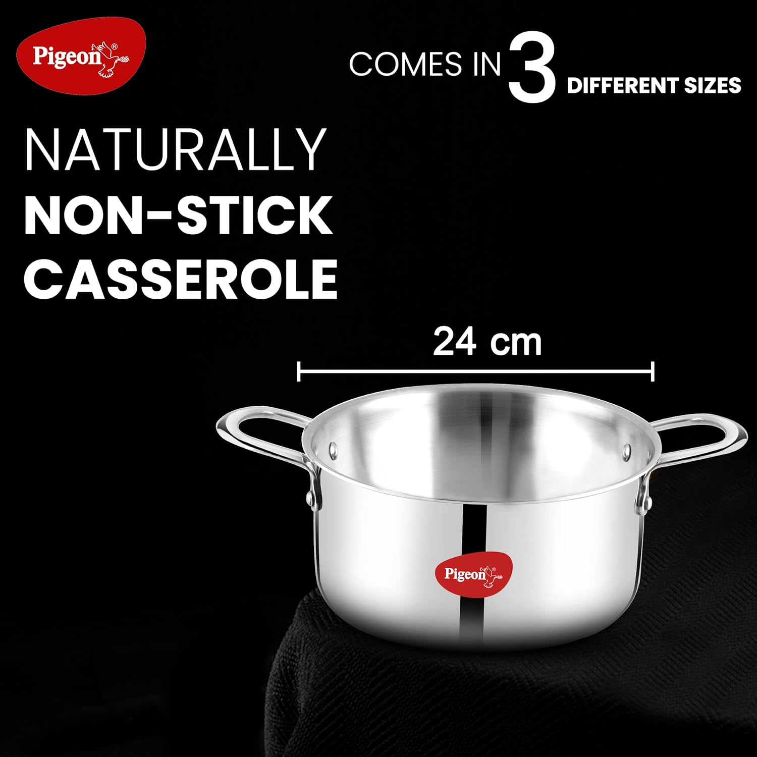 Pigeon Elite Stainless Steel Triply Casserole 24 cm, Gas Stove and Induction Compatible for Fast Cooking and Longer Heat Retention, Along with Even Heat Distribution- Silver
