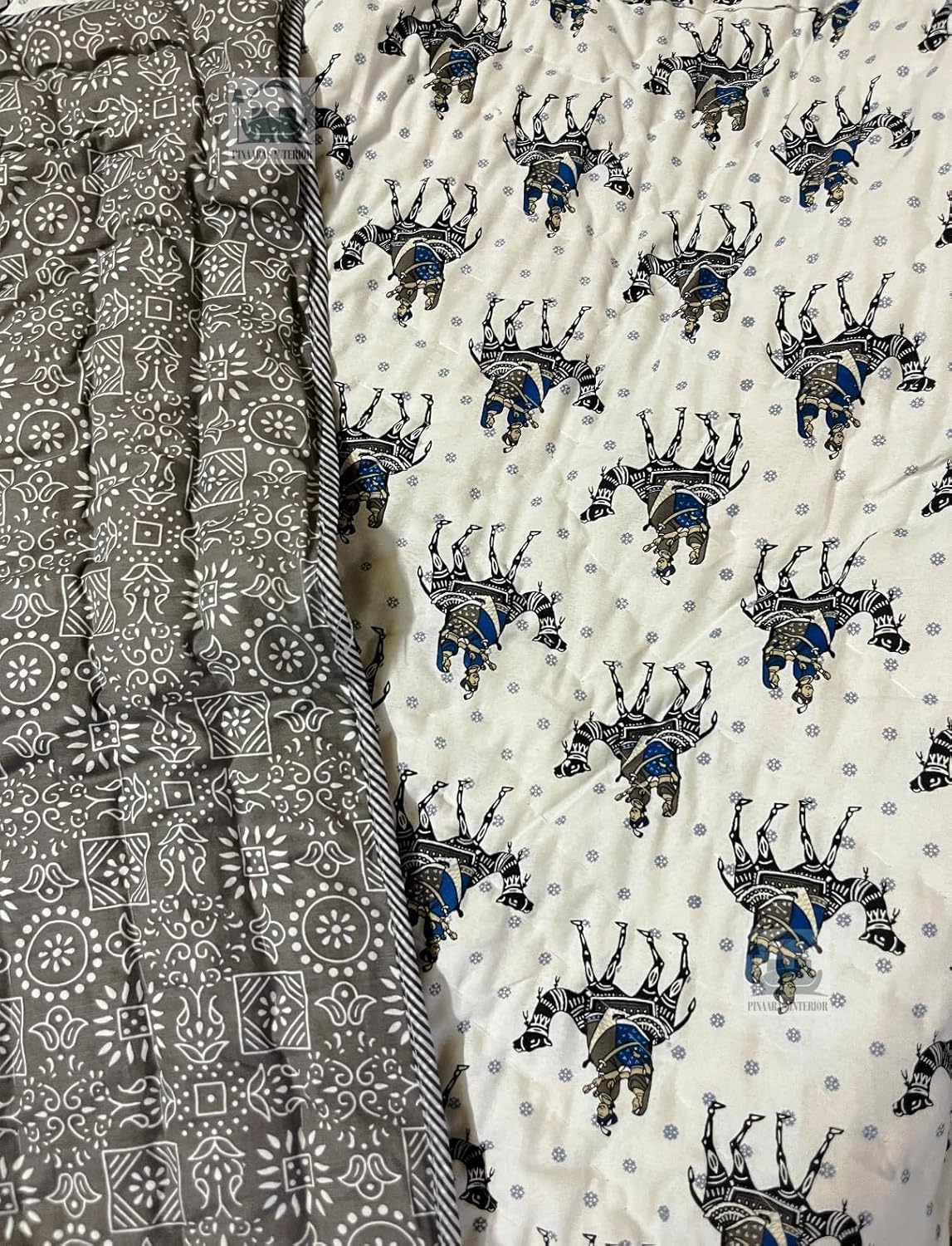 PINAARAS INTERIOR Presents World famous Jaipuri Bed Blanket Razai (Quilt) in traditional print of Rajasthan Jaipuri quilts / Razai are characterized by their incredible feather-weight lightness, softness, and warmth. The brightly colored Jaipuri Quilts can enhance the décor of your bedroom while providing an unmatched level of comfort to you and your family. This cotton Quilt possesses a beautiful print pattern that has been further accentuated with intricate Hand block and screen print. ✔Material: Screen Printed 100% Cotton Fabric & other side Matching Plain cotton Soft, Pure Cotton & lightweight Jaipuri Rajai/Quilt. ✔100 percent Organic Cotton shell for a rich luxurious feel. ✔Layers of Material: Upper and Last Layer Made From 100% Pure Cotton Cloth, Middle Layer 100% Organic Soft Cotton Inside That Makes This Cotton Quilt Soft and Warm, yet Lightweight. ✔Perfect for usage in Winter and in Air-Conditioned rooms. Jaipuri Bed Blanket Razai Hand Made by skilled artisans with the Pure Organic Cotton with Jaipuri Prints to create a beautifully soft texture & Good Looking. Double hand-stitched pattern to keep the filling in place for Long durabilit