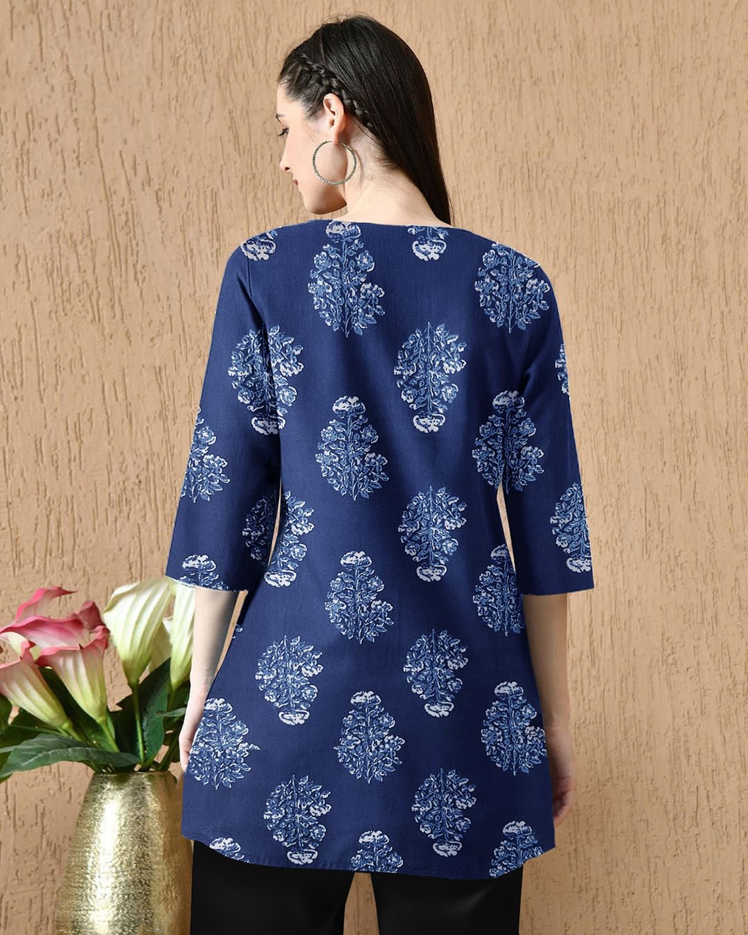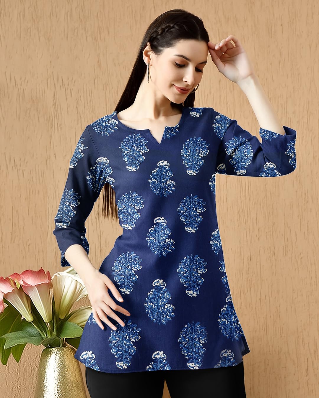 women cotton blend short kurti, designed to blend traditional style with modern comfort. The breathable cotton blend fabric ensures all-day freshness, while the stylish print and flattering silhouette make it perfect for both daily wear and office attire. Pair this trendy kurti with jeans or leggings for an effortlessly chic look. Whether you’re heading to work, college, or a casual outing, this short kurti brings together comfort, elegance, and versatility in one outfit.