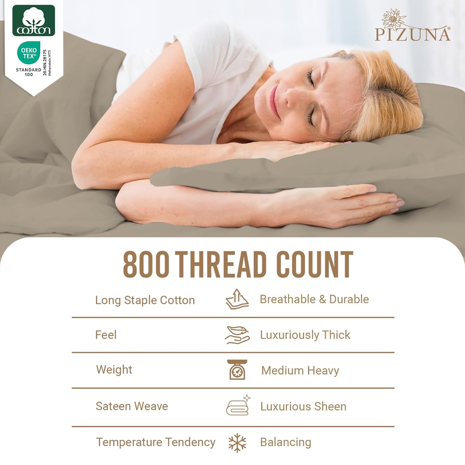 100% Pure & Natural Mercerized Combed Cotton: Made from Pizuna’s fine yarn technique, these authentic 800 thread count flat sheets feature a single dent (4 up-1 down) sateen weave. Pure and natural mercerized combed cotton bedding wrinkles initially, but it softens with each wash and the wrinkling reduces, while giving a crisp look.