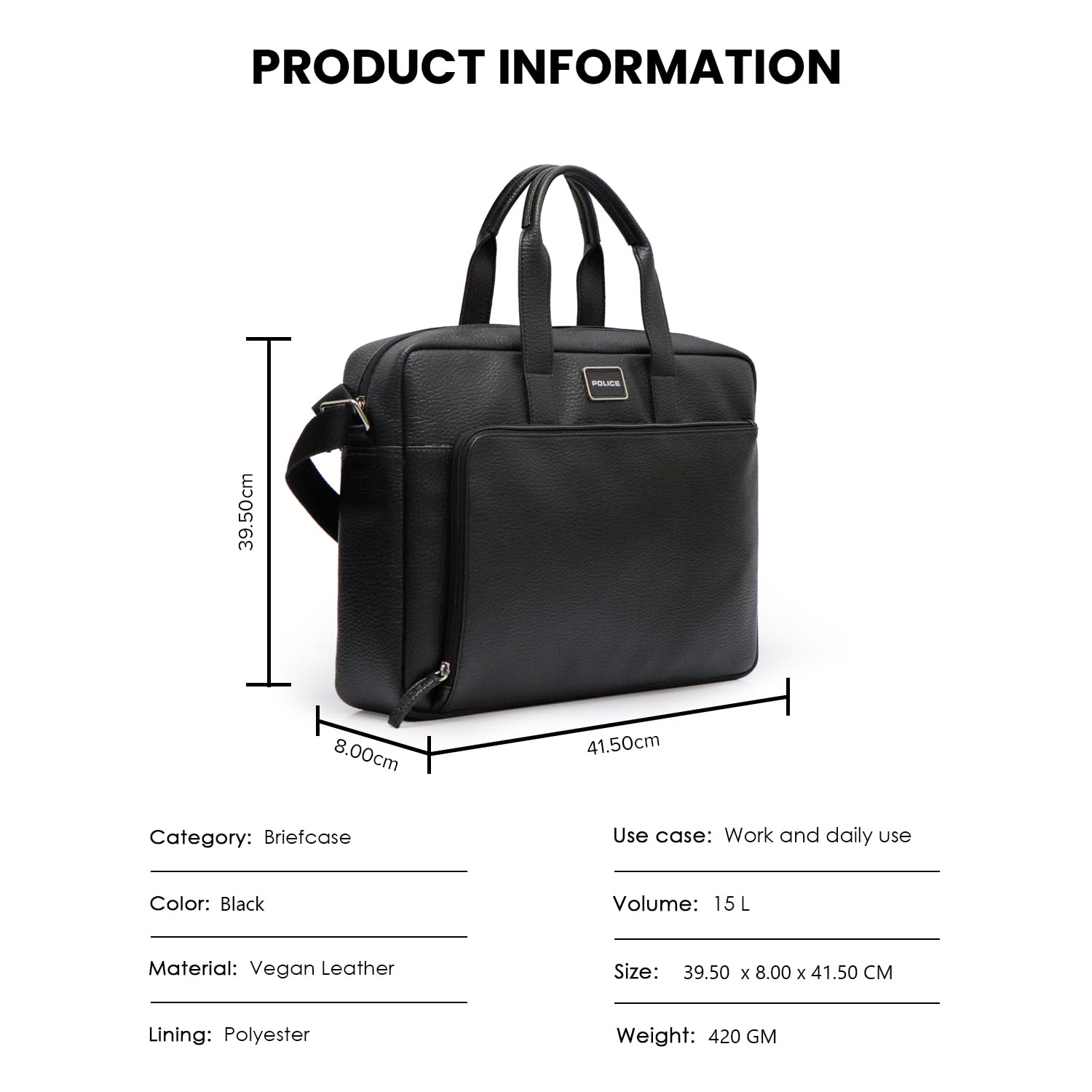 Upgrade your professional style with the Police Premium 14″ Briefcase for Men, designed for modern professionals who need both functionality and sophistication. Crafted with a sleek and durable exterior, this briefcase offers a dedicated padded compartment that safely fits laptops up to 14 inches, protecting your device during daily commutes or business travel. The bag features a spacious interior to neatly organize documents, gadgets, and everyday essentials, while the front utility pocket allows quick access to smaller items like chargers, pens, or a phone. The adjustable branded shoulder strap provides comfortable carrying, and the sturdy handles add a classic executive touch. Whether you’re heading to the office, meetings, or business trips, this professional briefcase blends style, convenience, and durability for everyday work use.