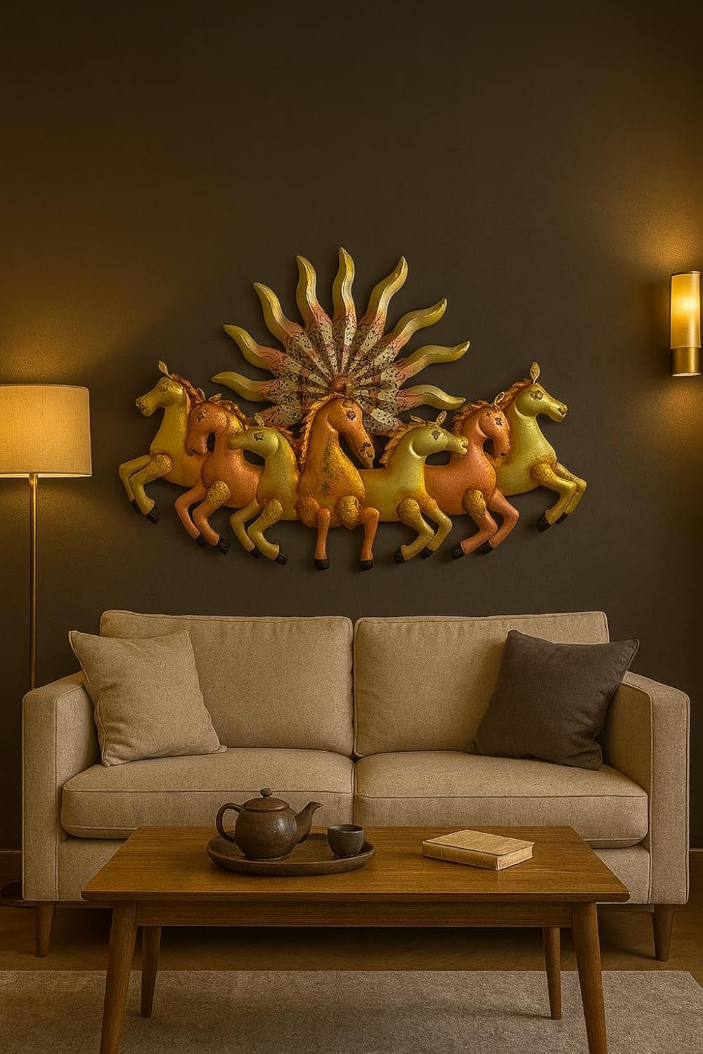 Transform your living space with this striking metal wall art featuring seven galloping horses and a radiant sun design. This magnificent piece combines artistry with illumination, incorporating LED lights that add a magical glow to its metallic finish. The horses, rendered in stunning gold and copper tones, appear to leap across your wall in a dynamic display of movement and grace. Measuring 94 x 58 centimetres, this substantial decorative piece makes a bold statement in any room. The intricate detailing on each horse, coupled with the ornate sunburst pattern, showcases superior craftsmanship. The combination of warm metallic finishes creates a luxurious effect that catches and reflects light beautifully. Perfect for living rooms, entrance halls, or office spaces, this wall décor adds a touch of grandeur and positive energy to your interior. The LED lighting feature enhances the dramatic effect, especially in evening ambiance, making it a truly versatile piece of home décor that seamlessly blends traditional symbolism with contemporary design.
