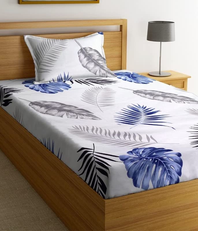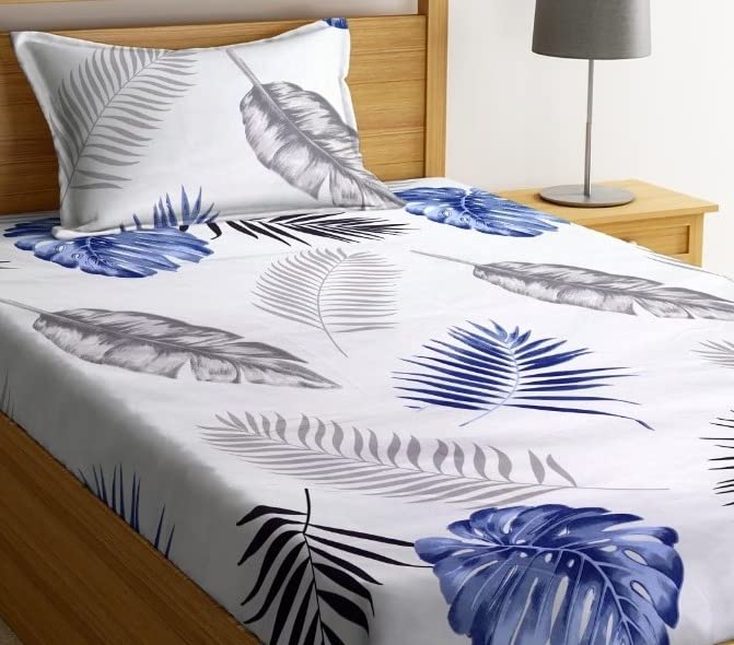 Premium Glace Cotton 180 TC Flat Single Bedsheets for Summer Breathable | Wrinklefree (Size-60 X 90 Inch) with 1 Pillow Covers (Size-17 X 27 Inches, White Blue Feather)