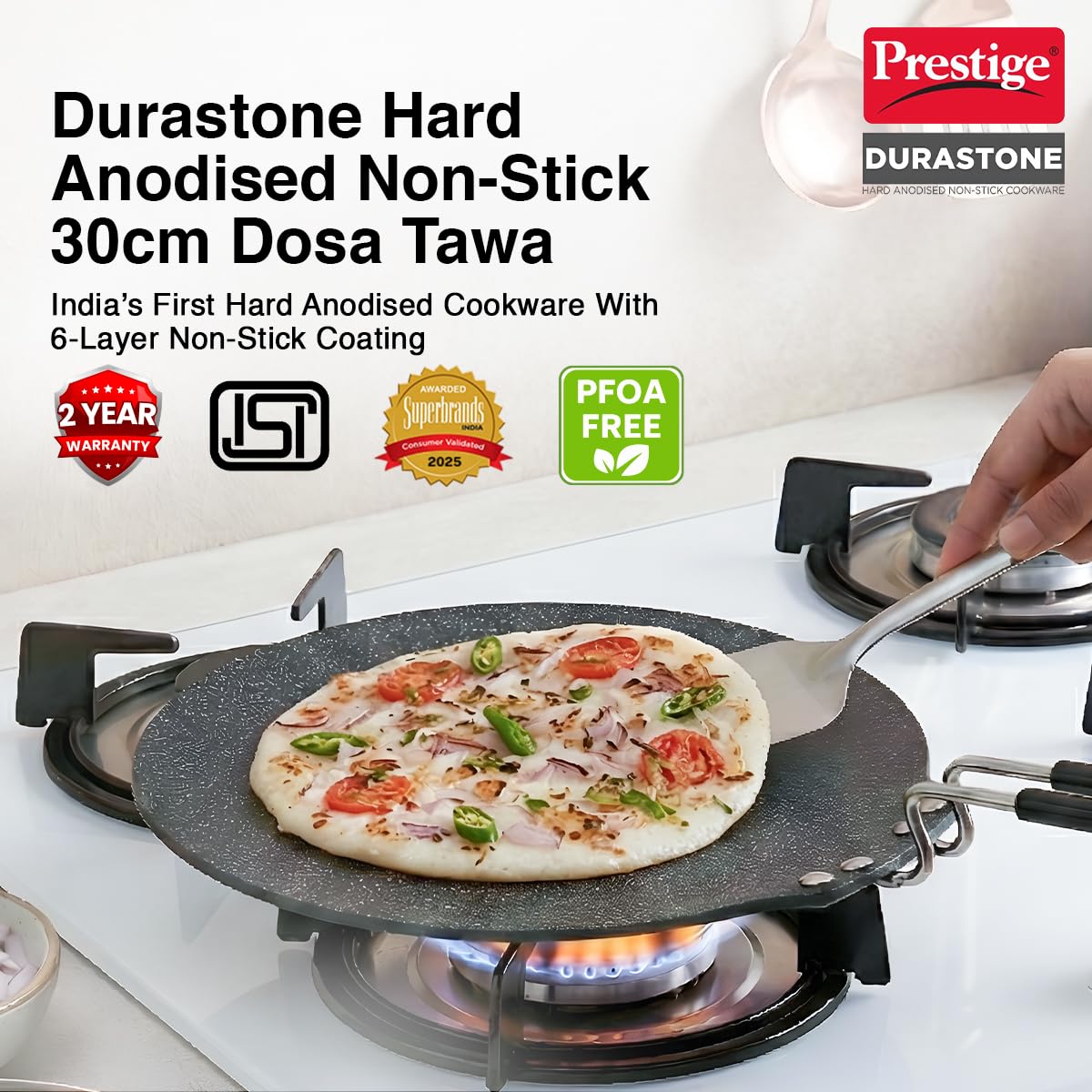 Prestige Durastone Hard Anodised Non-Stick Dosa Tawa 30cm|6 Layers Extra Durable Stone Coating|Stainless Steel Cool Touch Handles|Induction & Gas Compatible|2 Years Warranty