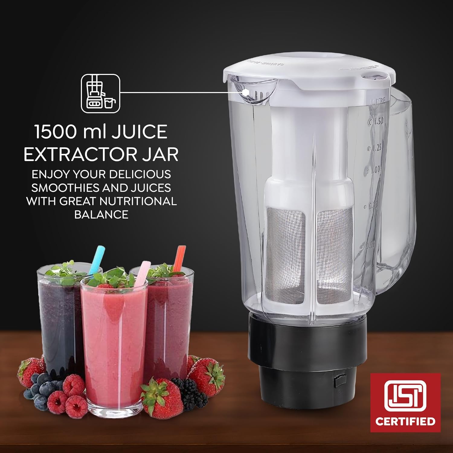 Juicer Jar With Sieve- Unbreakable Polycarbonate Juicer Jar With Advanced Ss Sieve Design For Efficient Juicing. It Even Filters The Pulp To Prepare Fruit Juice The Way You Like It.; Dome Shaped Lid- For Easy Viewing Of The Ingredients And The Cap Makes It Easy To Add Ingredients To The Mix Without Having To Remove The Lid.