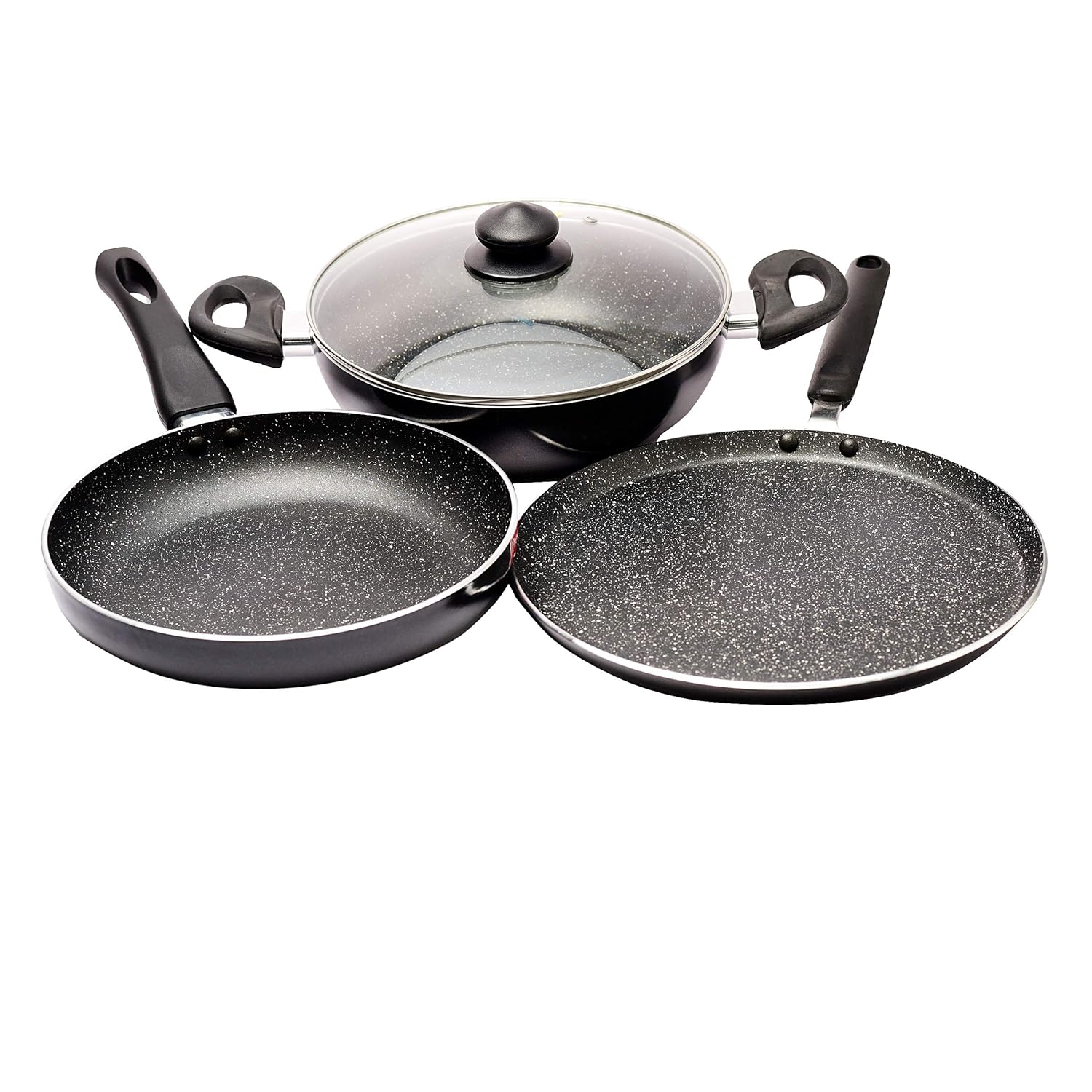 This cookware set contains a frying pan- 240mm Dia, Kadai 240mm Dia, Omni tawa 280mm Dia