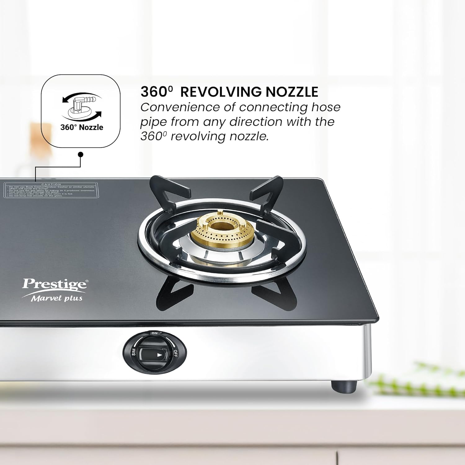 Gas stove type: Manual; Burner material: Brass; Size of the burner: 1 Small, 1 Medium; Material of the body: Stainless Steel; Material of the top: Toughened Glass-Top; Size of the gas stove (in cm): 66.5*35.5*13; Colour: Black