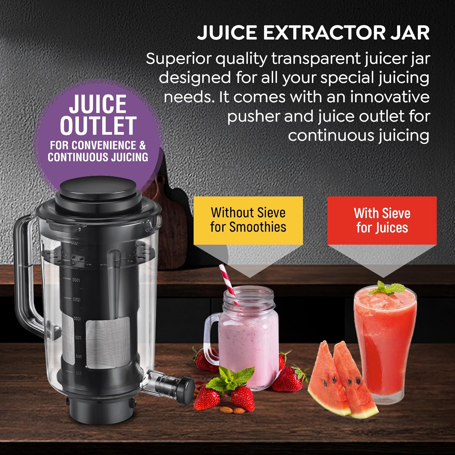 3 Full-Size Stainless Steel Jars- Made with superior quality stainless Steel for durability and a sparkling mirror finish; Juicer Extracter Jar comes with pusher and juice outlet to aid in continuous juicing